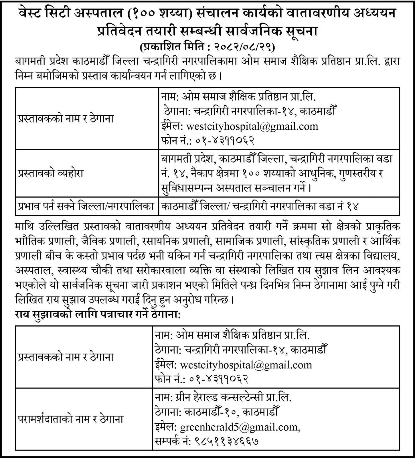 ओम समाज शैक्षिक प्रतिष्ठानले नैकापमा वेस्ट सिटी अस्पताल सञ्चालनका लागि वातावरणीय अध्ययन प्रतिवेदन तयारीका लागि सोमबार सार्वजनिक सूचना जारी गरेको छ ।