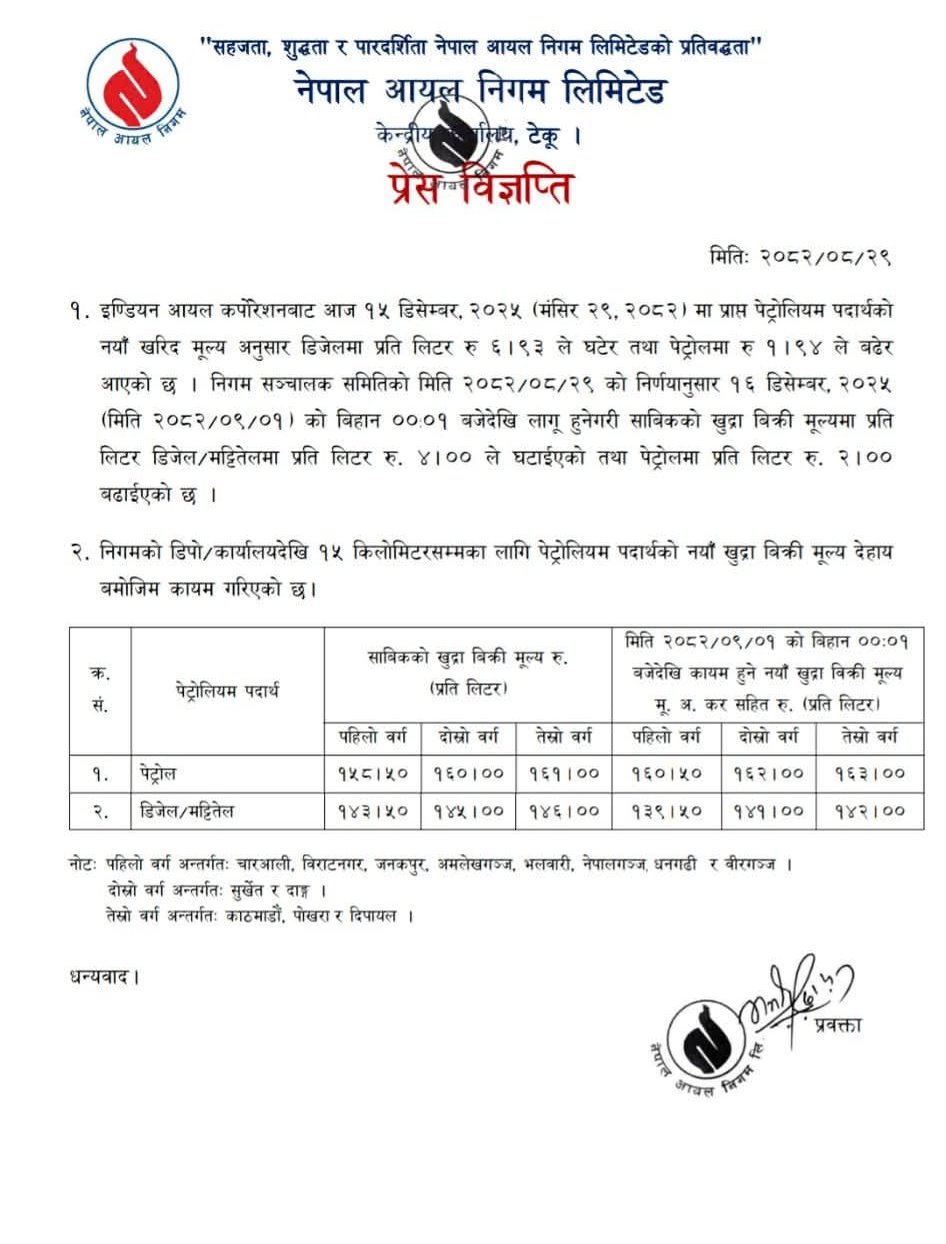 डिजेल र मट्टीतेलको मूल्य भने घटाइएको छ ।