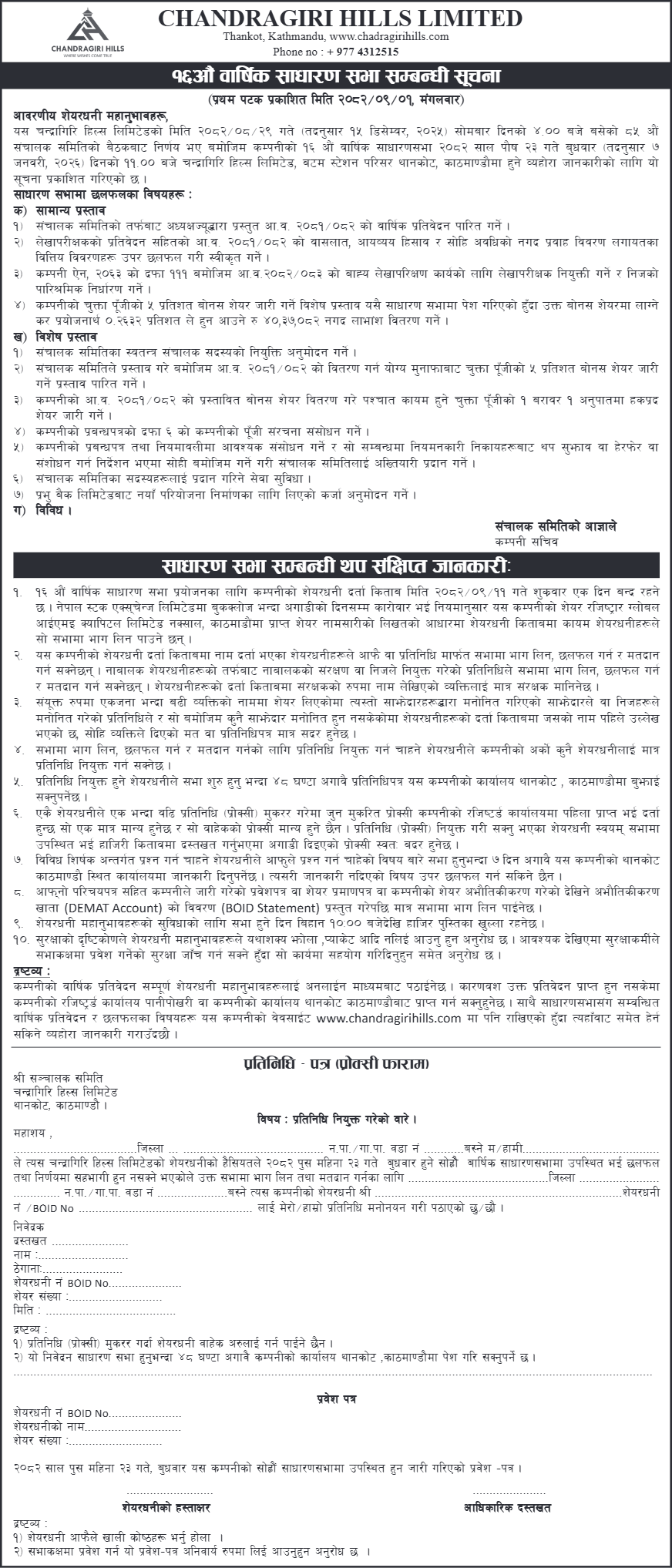 साथै, बैठकले कम्पनीको १६औं वार्षिक साधारण सभा यहि पुष २३ गते चन्द्रागिरि हिल्स लिमिटेड, बटम स्टेशन परिसर थानकोट, काठमाडौंमा बिहान ११ बजे डाकेको छ ।