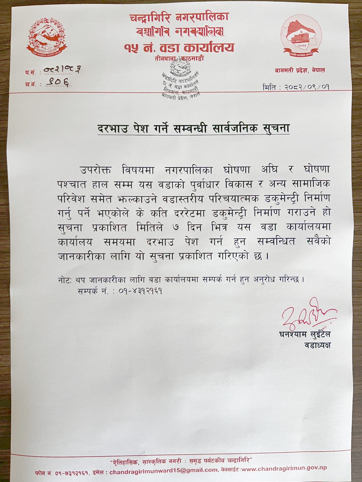 चन्द्रागिरि नगरपालिका वडा नं. १५ तीनथानाले डकुमेन्ट्री निर्माणका लागि दरभाउ पेश गर्न सूचित गरेको छ ।