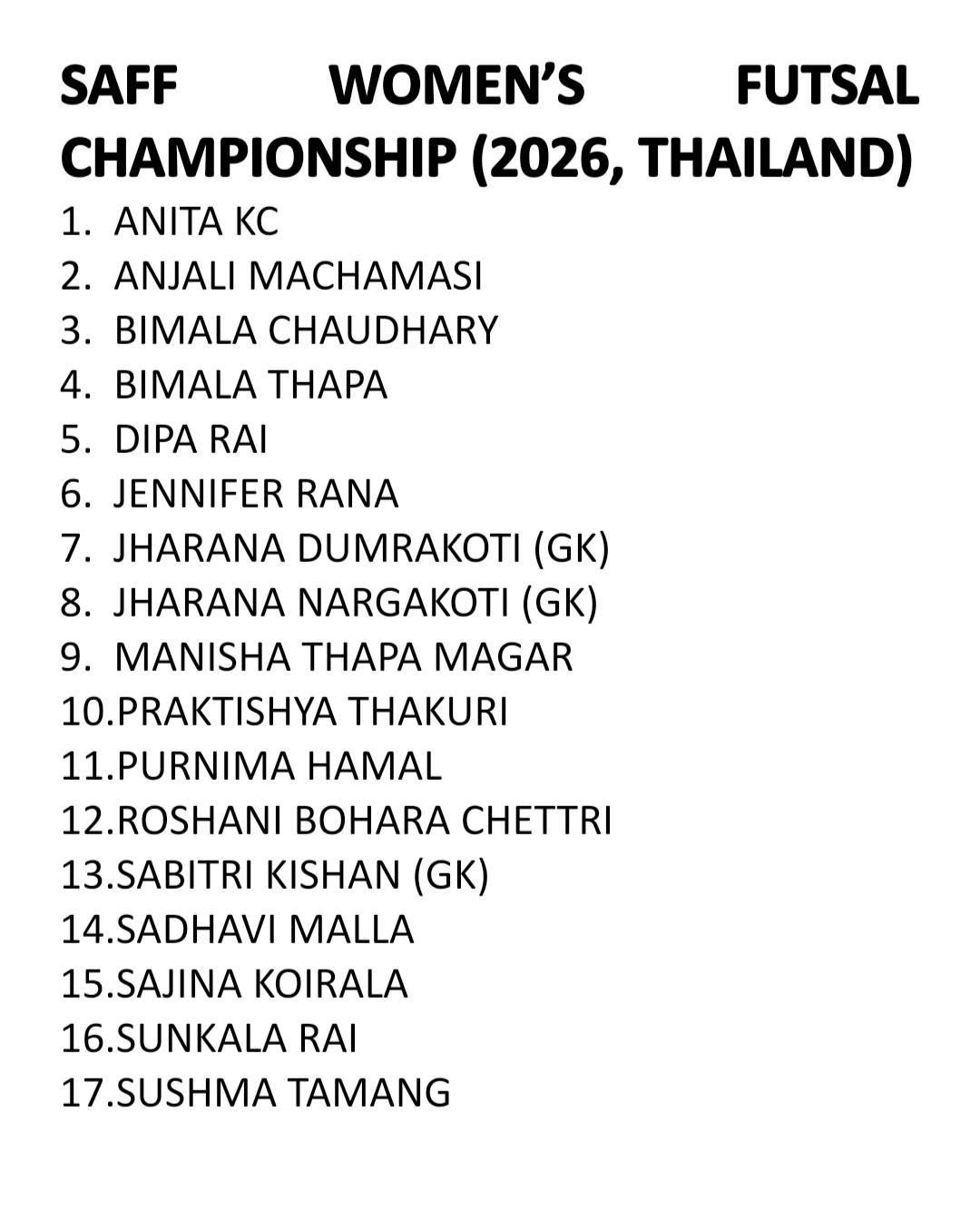थाइल्यान्डमा हुने साफ महिला फुटसल च्याम्पियनसिप खेल्ने नेपाली राष्ट्रिय फुटसल टिमको बन्द प्रशिक्षणमा १७ खेलाडी बोलाइएको छ ।