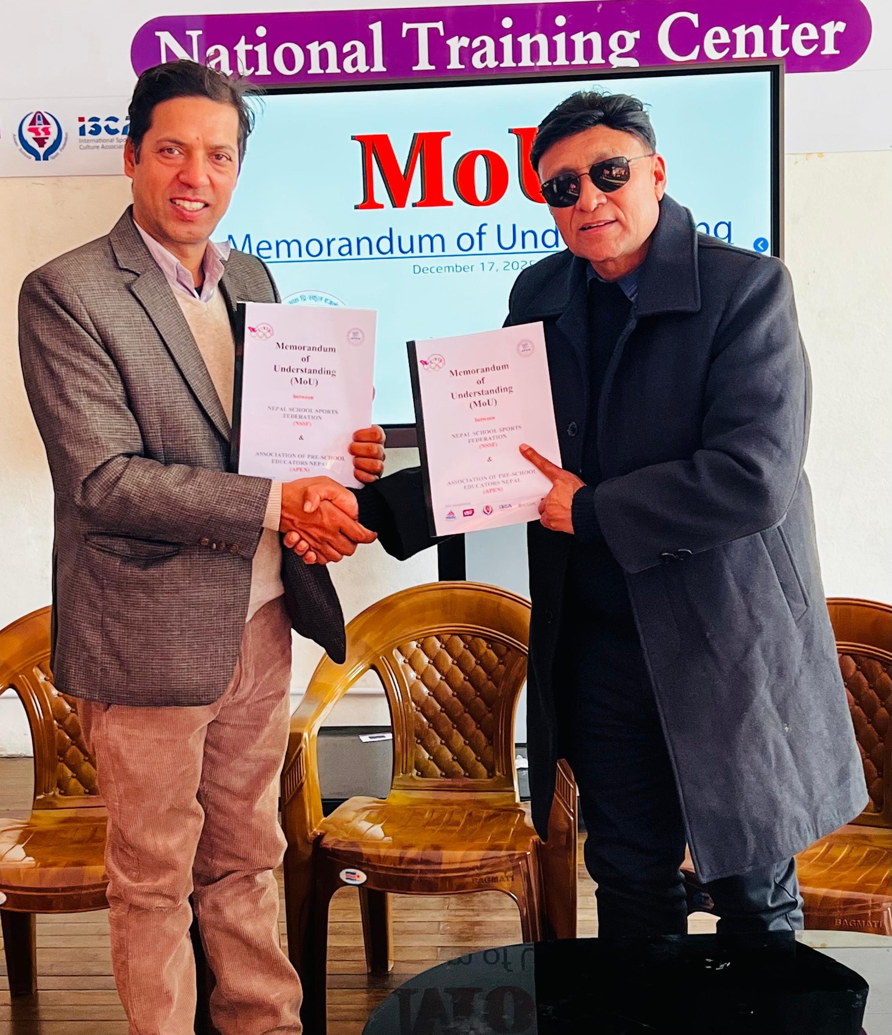 नेपाल विद्यालय खेलकुद महासंघ र एसोसिएसन अफ प्रि-स्कुल एजुकेटर्स नेपाल (अपेन) बीच विद्यालय तहका बालबालिकामा खेलकुद गतिविधि प्रवर्द्धन गर्ने उद्देश्यसहित समझदारीपत्रमा हस्ताक्षर सम्पन्न भएको छ ।