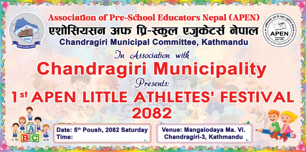 चन्द्रागिरि नगरपालिकासँगको सहकार्यमा एशोसियसन अफ प्रि-स्कुल एजुकेटर्स नेपाल (अपेन)ले आउँदो शनिबार (पाैष ५) पहिलो संस्करणको अपेन लिटिल एथ्लेट्स फेस्टिभल सञ्चालन हुने भएको छ ।