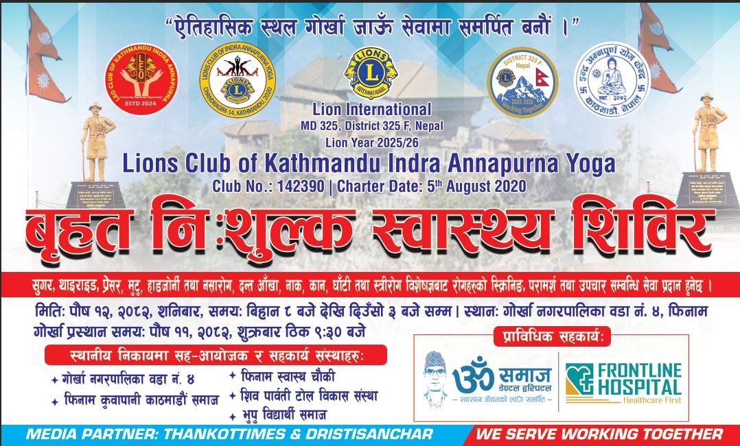चन्द्रागिरि नगरपालिका नैकापस्थित लायन्स क्लब अफ काठमाण्डौं इन्द्र अन्नपुर्ण योगाको अग्रसरतामा यही पाैष १२ गते गोरखा जिल्लामा निःशुल्क स्वास्थ्य शिविरको आयोजना हुने भएको छ ।