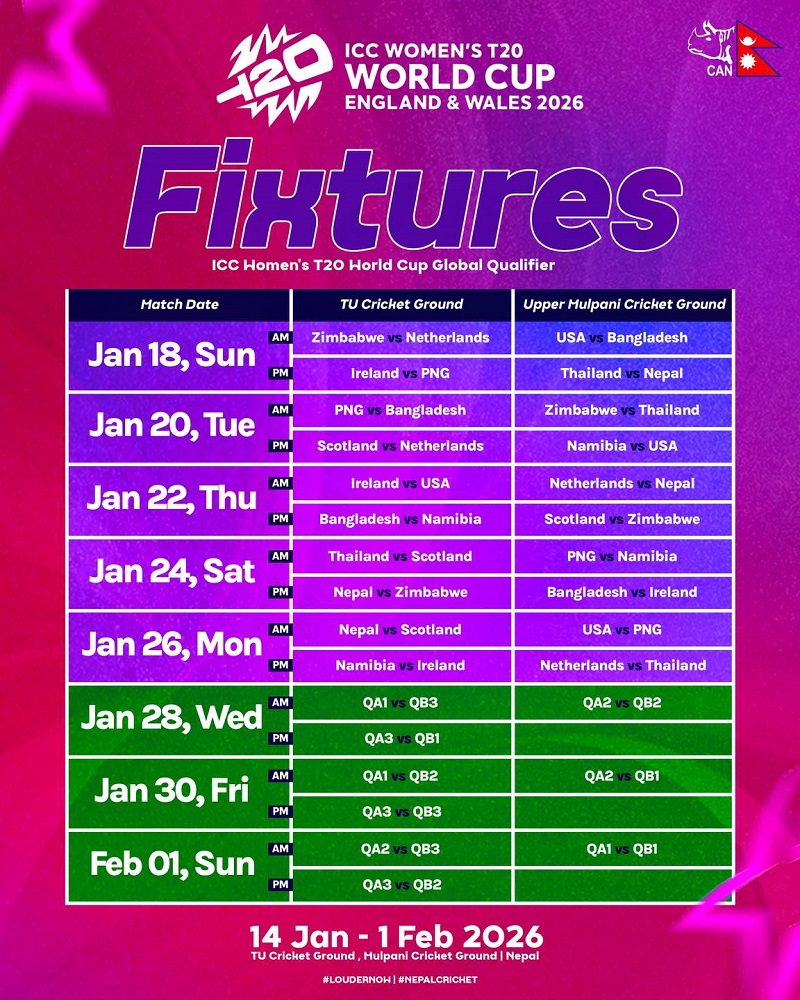 काठमाडाैंमा हुने महिला टी-२० विश्वकप छनोटको खेलतालिका सार्वजनिक