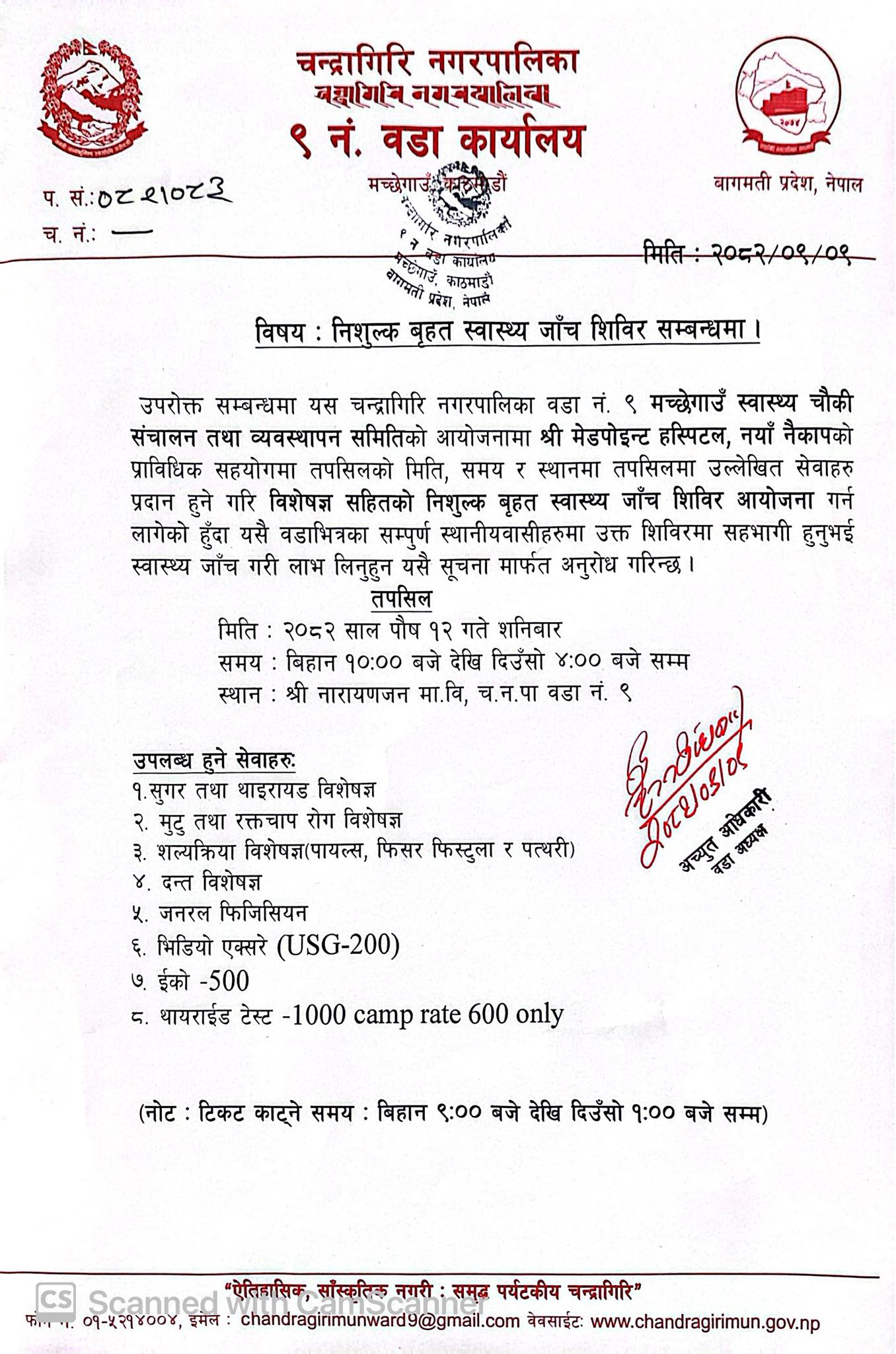 आज शनिबार चन्द्रागिरि नगरपालिका-०९ मच्छेगाउँमा निःशुल्क स्वास्थ्य शिविर सञ्चालन हुँदैछ ।