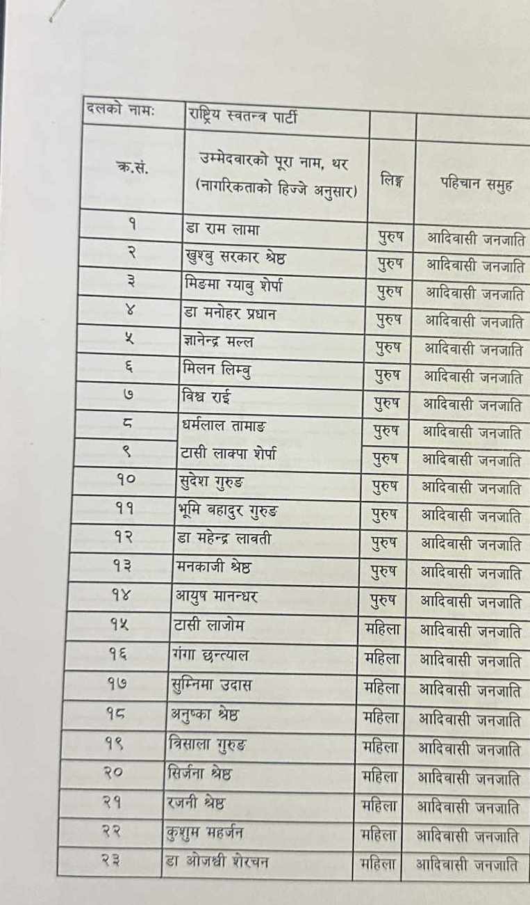 राष्ट्रिय स्वतन्त्र पार्टी (रास्वपा)ले आगामी फागुन २१ मा हुने प्रतिनिधि सभा सदस्य निर्वाचनका निम्ति समानुपातिकतर्फको बन्दसूची निर्वाचन आयोगमा पेश गरेको छ ।