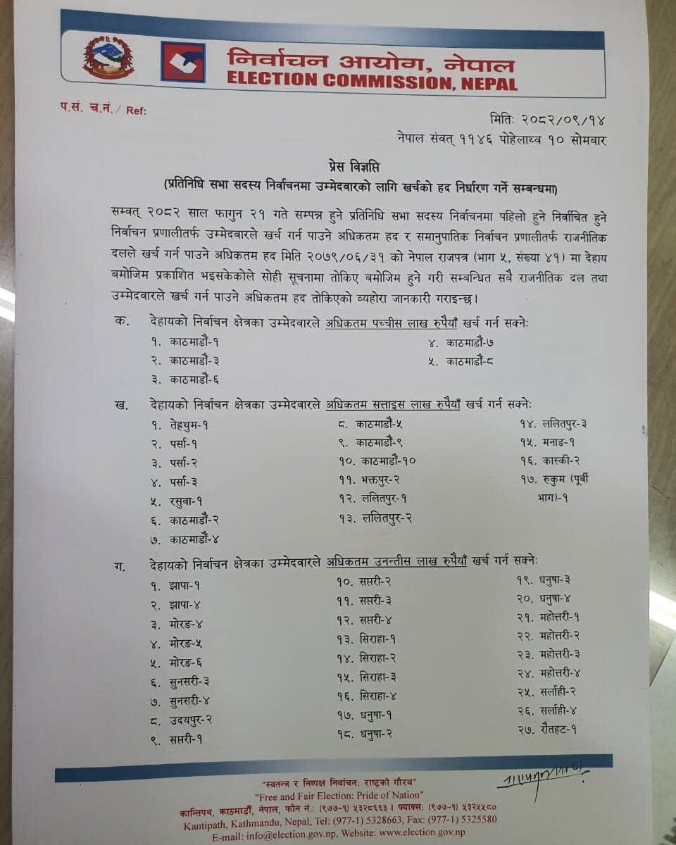 विज्ञप्तिमा उल्लेख अनुसार काठमाडाैं क्षेत्र नं. ९ र १० का उम्मेदवारले चुनावमा अधिकतम २७ लाख रुपैयाँसम्म खर्चन पाउनेछन् ।