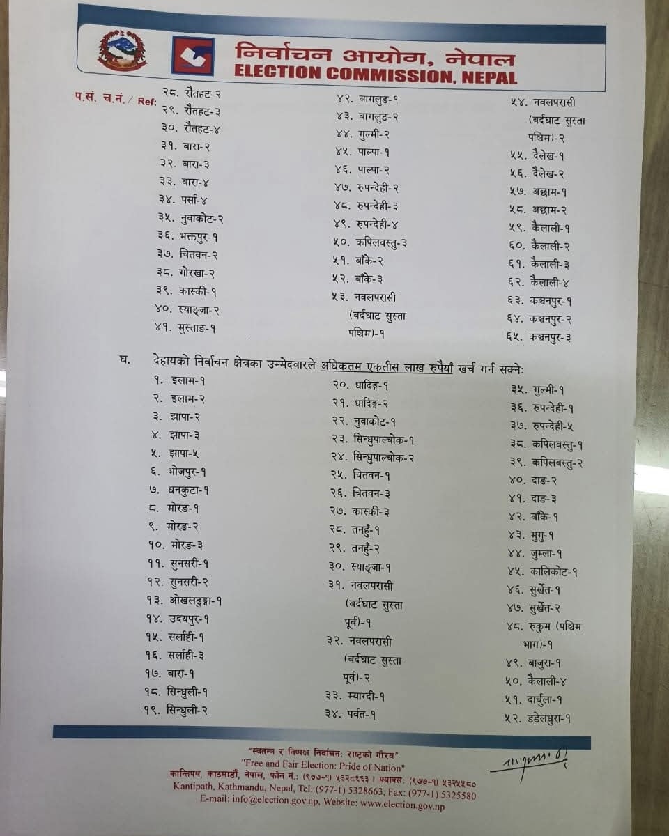 प्रतिनिधि सभा सदस्य निर्वाचनमा काठमाडाैं क्षेत्र नं. १० का उम्मेदवारको खर्च सीमा २७ लाख