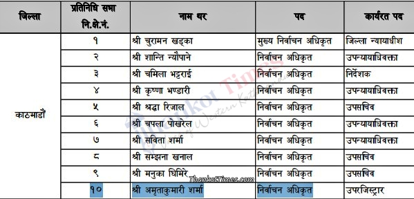 मुख्य निर्वाचन अधिकृत र निर्वाचन अधिकृत नियुक्त, काठमाडाैं क्षेत्र नं. १० मा अमृताकुमारी शर्मा