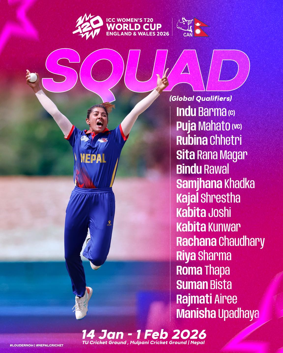 नेपाल क्रिकेट संघ (क्यान) ले आइतबार इन्दु वर्माको कप्तानीमा १५ सदस्यीय राष्ट्रिय टोली सार्वजनिक गरेको हो ।
