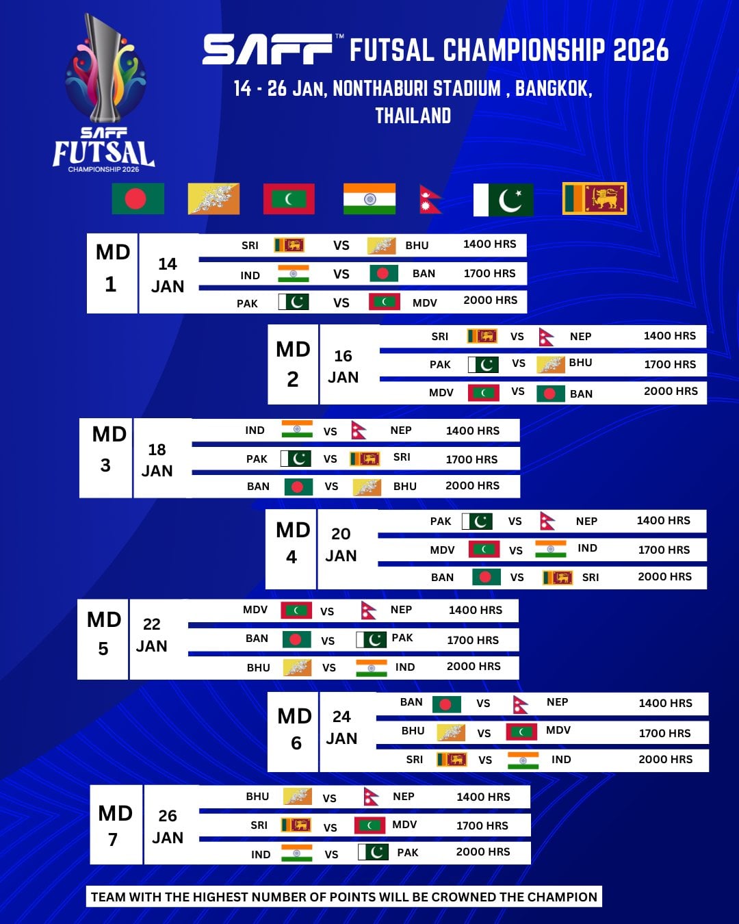 त्यसपछि, नेपालले प्रतियोगितामा भारतसँग जनवरी १८, पाकिस्तानसँग जनवरी २०, माल्दिभ्ससँग जनवरी २२, बंगलादेशसँग जनवरी २४ र भुटानसँग जनवरी २६ मा खेल्ने तालिका छ ।