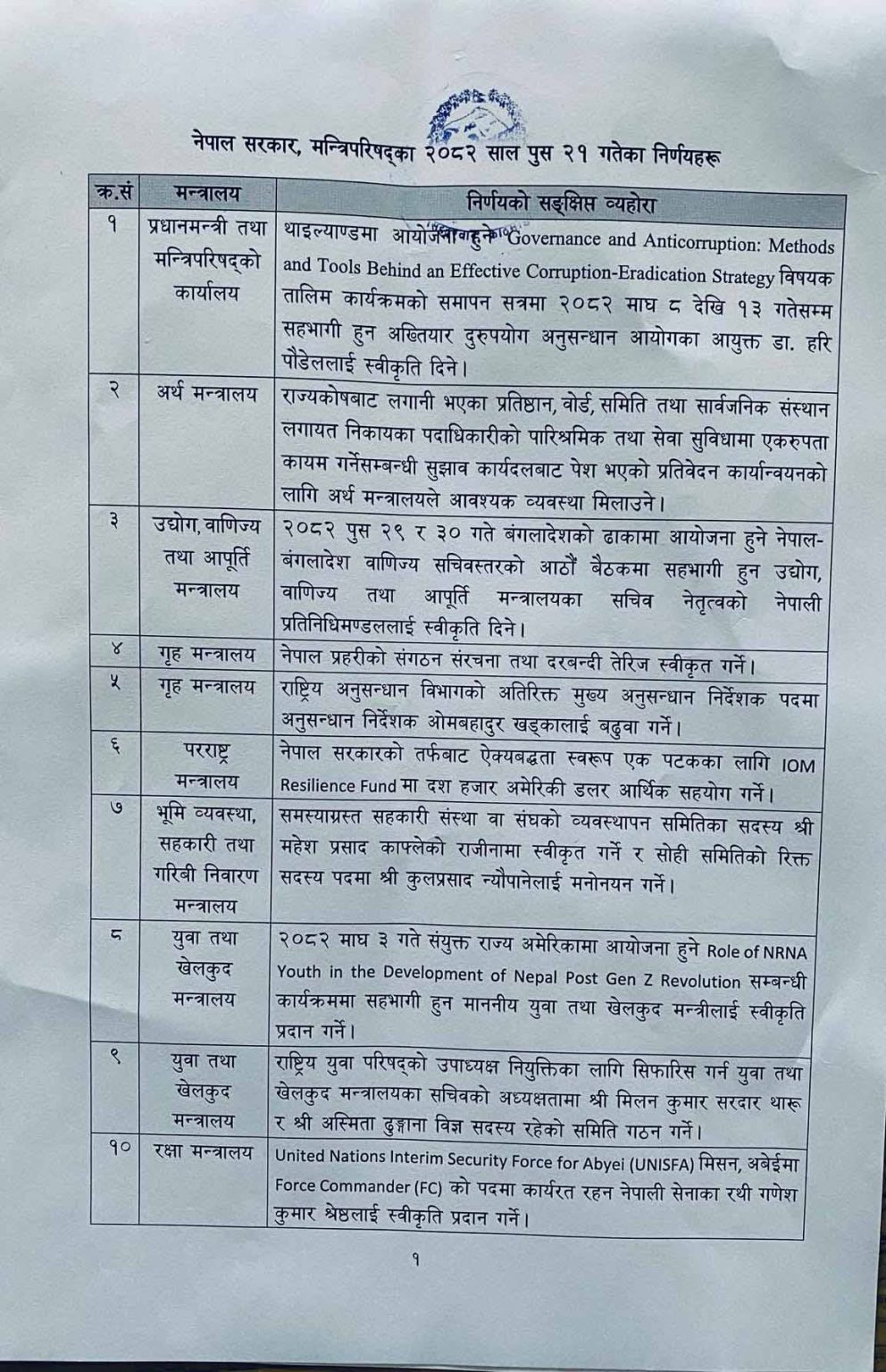 बैठकले पुष २९ र ३० गते बङ्ग्लादेशको ढाकामा आयोजना हुने नेपाल बङ्ग्लादेश वाणिज्य सचिव स्तरको आठौं बैठकमा सहभागी हुन उद्योग, वाणिज्य तथा आपूर्ति मन्त्रालयका सचिव नेतृत्वको नेपाली प्रतिनिधिमण्डललाई स्वीकृति दिने निर्णय गरेको छ । प्रहरीको सङ्गठन, संरचना तथा दरबन्दी त्यारी स्वीकृत गर्ने निर्णय भएको छ ।