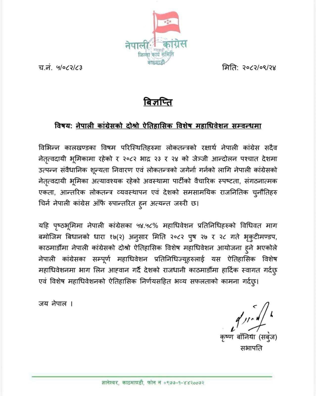 कांग्रेस काठमाडौंका जिल्ला सभापति कृष्ण सबुज बानियाँले बिहीबार एक विज्ञप्ति जारी गरी विधानको व्यवस्थाबमोजिम विशेष महाधिवेशन आह्वान भएकाले उक्त महाधिवेशनमा भाग लिन सबैलाई आह्वान गरेका हुन् ।