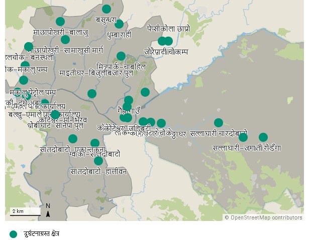 ढुङ्गाअड्डा-कलंकी क्षेत्रसहित यी हुन काठमाडौंमा धेरै दुर्घटना हुने २९ ब्ल्याक स्पट (नक्सासहित)