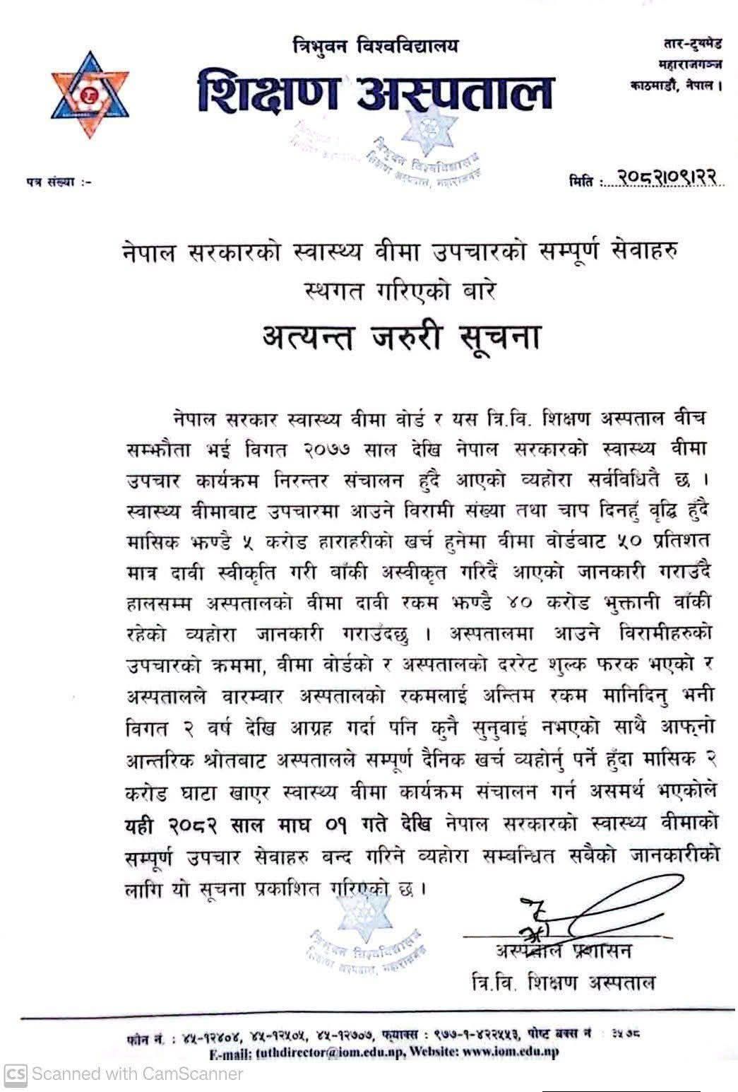 “स्वास्थ्य बीमाबाट उपचारमा आउने बिरामी सङ्ख्या तथा चाप दिनहुँ वृद्धि हुँदै गएको छ । यसबाट मासिक रु पाँच करोड हाराहारीको खर्च हुनेमा बीमा बोर्डबाट ५० प्रतिशत मात्र दाबी स्वीकृति गरी बाँकी अस्वीकृत गर्दै आएको छ । हालसम्म अस्पतालको बीमा दाबी रकम करिब रु ४० करोड भुक्तानी बाँकी छ” अस्पताल प्रशासनद्वारा जारी सूचनामा उल्लेख गरिएको छ ।