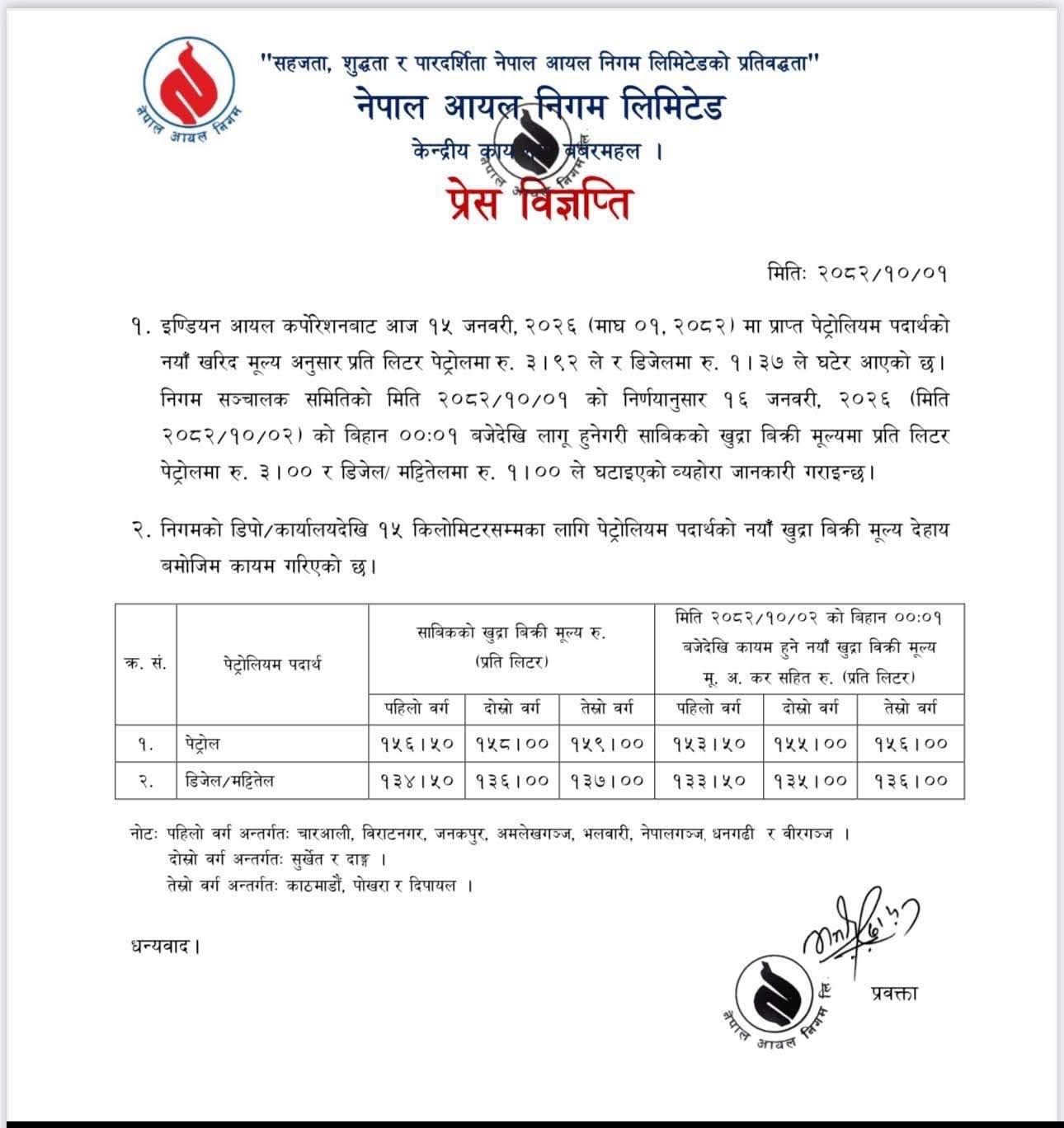 नेपाल आयल निगमले पेट्रोलियम पदार्थको मूल्य घटाएको छ ।