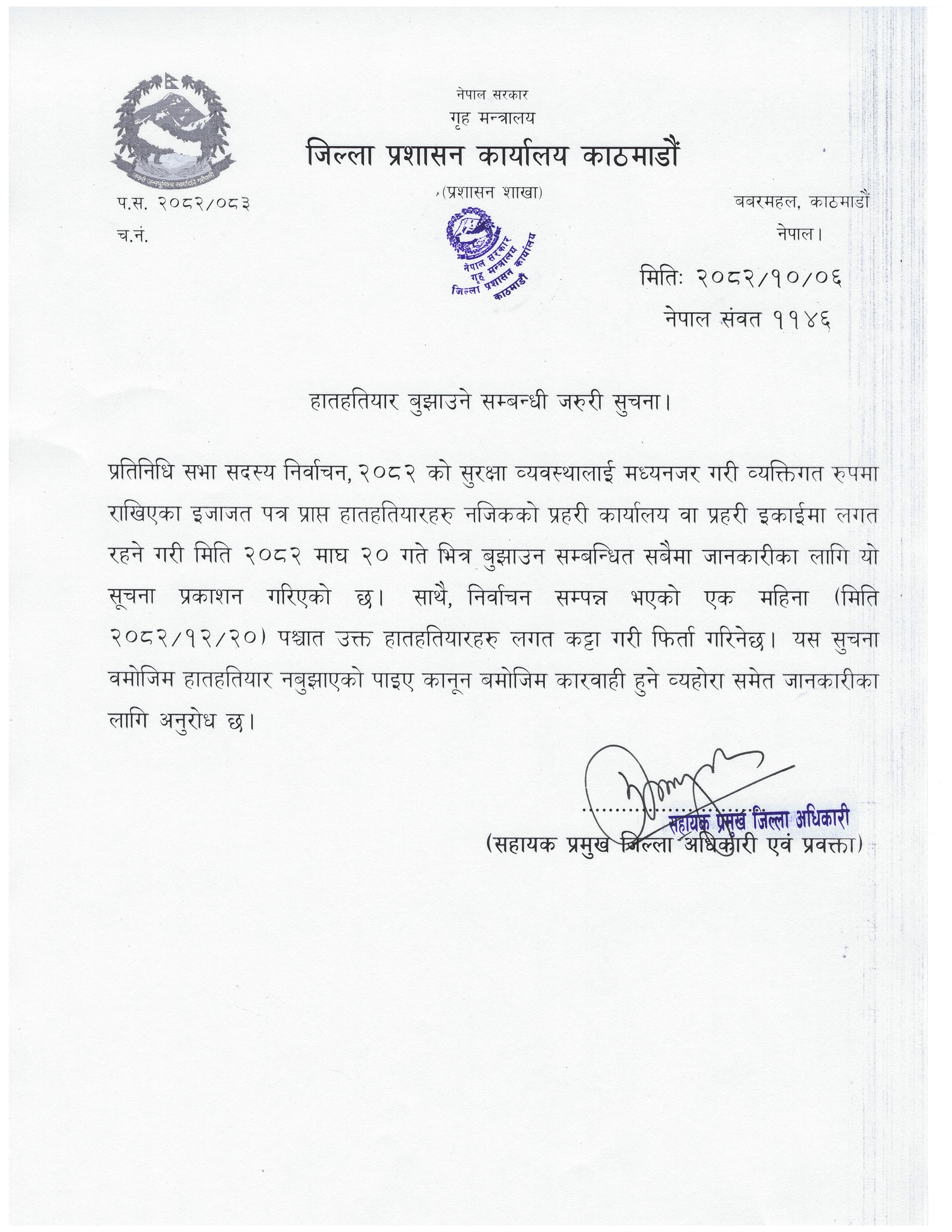 जिल्ला प्रशासन कार्यालय काठमाडौंले प्रतिनिधिसभा सदस्य निर्वाचन, २०८२ को सुरक्षा व्यवस्थालाई मध्यनजर गरी व्यक्तिगत रूपमा राखिएका इजाजतपत्र प्राप्त हातहतियार बुझाउन अनुरोध गरेको छ।