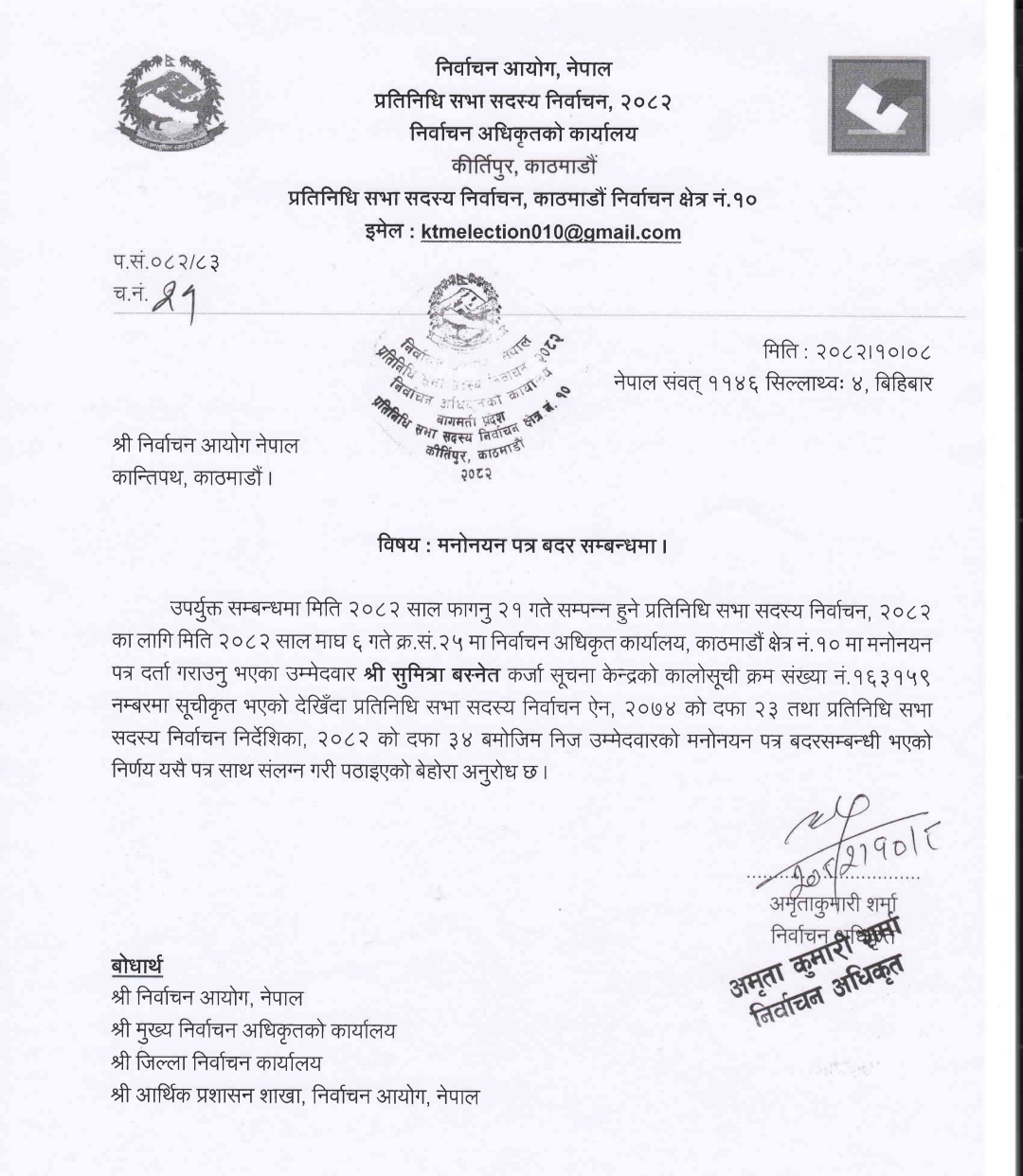 निर्वाचन अधिकृतको कार्यालयले मितेरी पार्टी नेपालका तर्फबाट उमेदवार बनेकी सुमित्रा बस्नेतको मनोनयनपत्र बदर गरेको हो ।