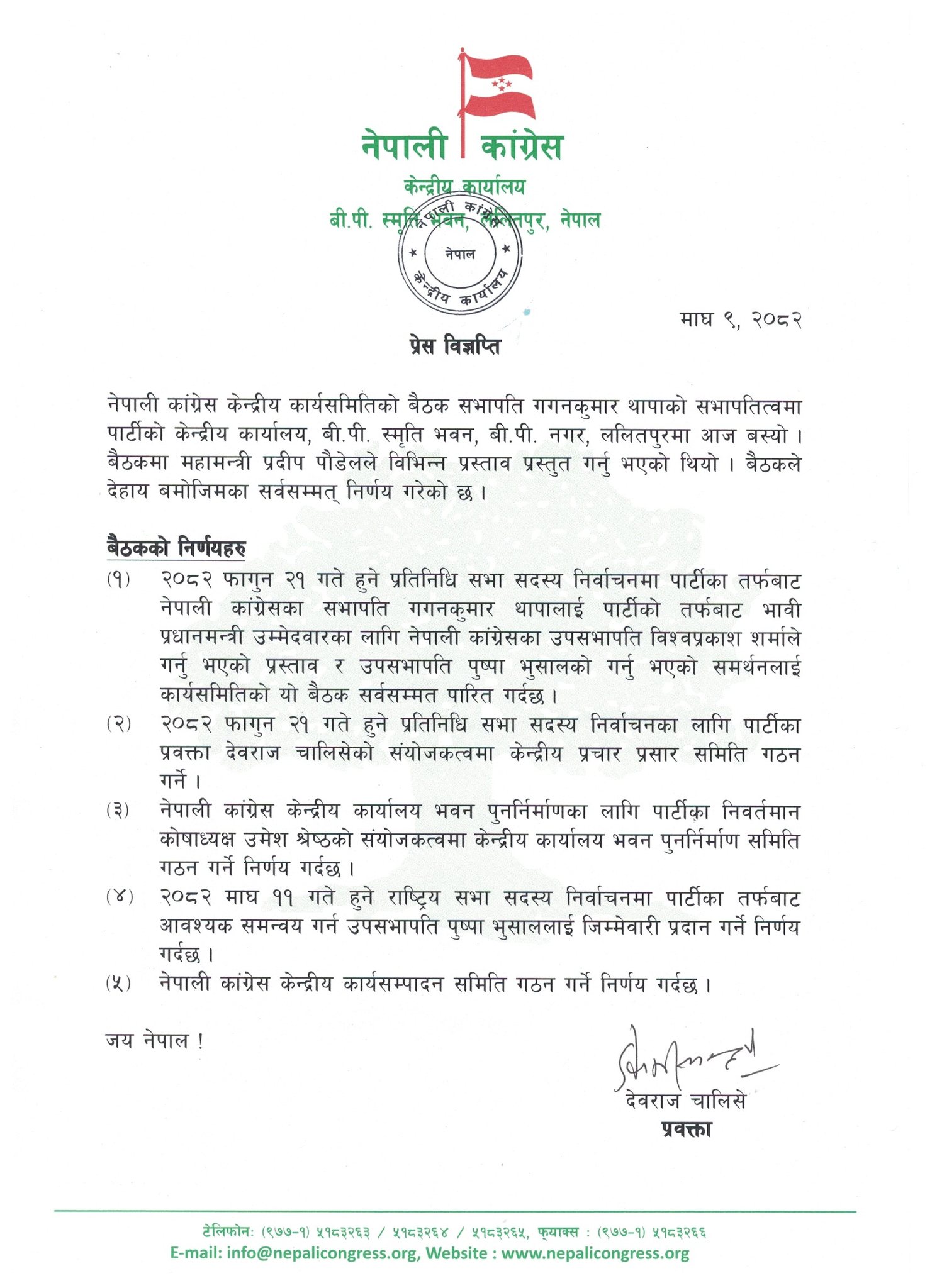 आगामी फागुन २१ गते हुने प्रतिनिधिसभा सदस्य निर्वाचनका लागि पार्टी सभापति गगन थापालाई भावी प्रधानमन्त्री उम्मेदवार बनाउने निर्णय बैठकले गरेको हो ।