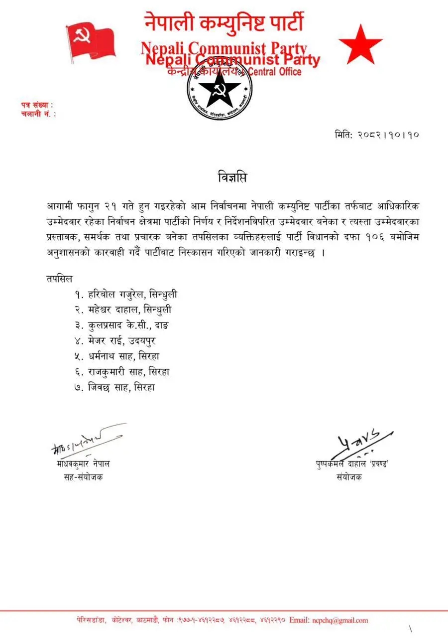 नेकपाले शनिबार जारी गरेको विज्ञप्तिमा भनिएको छ, ‘आगामी फागुन २१ गते हुन गइरहेको आमनिर्वाचनमा नेपाली कम्युनिस्ट पार्टीका तर्फबाट आधिकारिक उम्मेदवार रहेका निर्वाचन क्षेत्रमा पार्टीको निर्णय र निर्देशनविपरीत उम्मेदवार बनेका र त्यस्ता उम्मेदवारका प्रस्तावक, समर्थक तथा प्रचारक बनेका तपसिलका व्यक्तिहरूलाई पार्टी विधानको दफा १०६ बमोजिम अनुशासनको कारबाही गर्दै पार्टीबाट निष्काशन गरिएको छ ।’