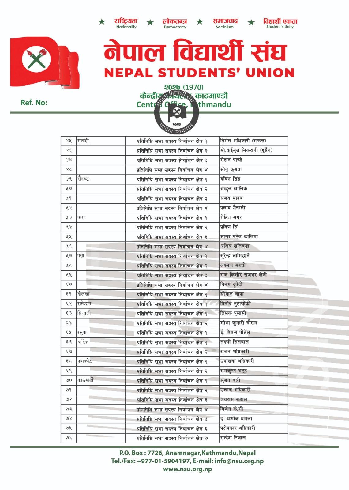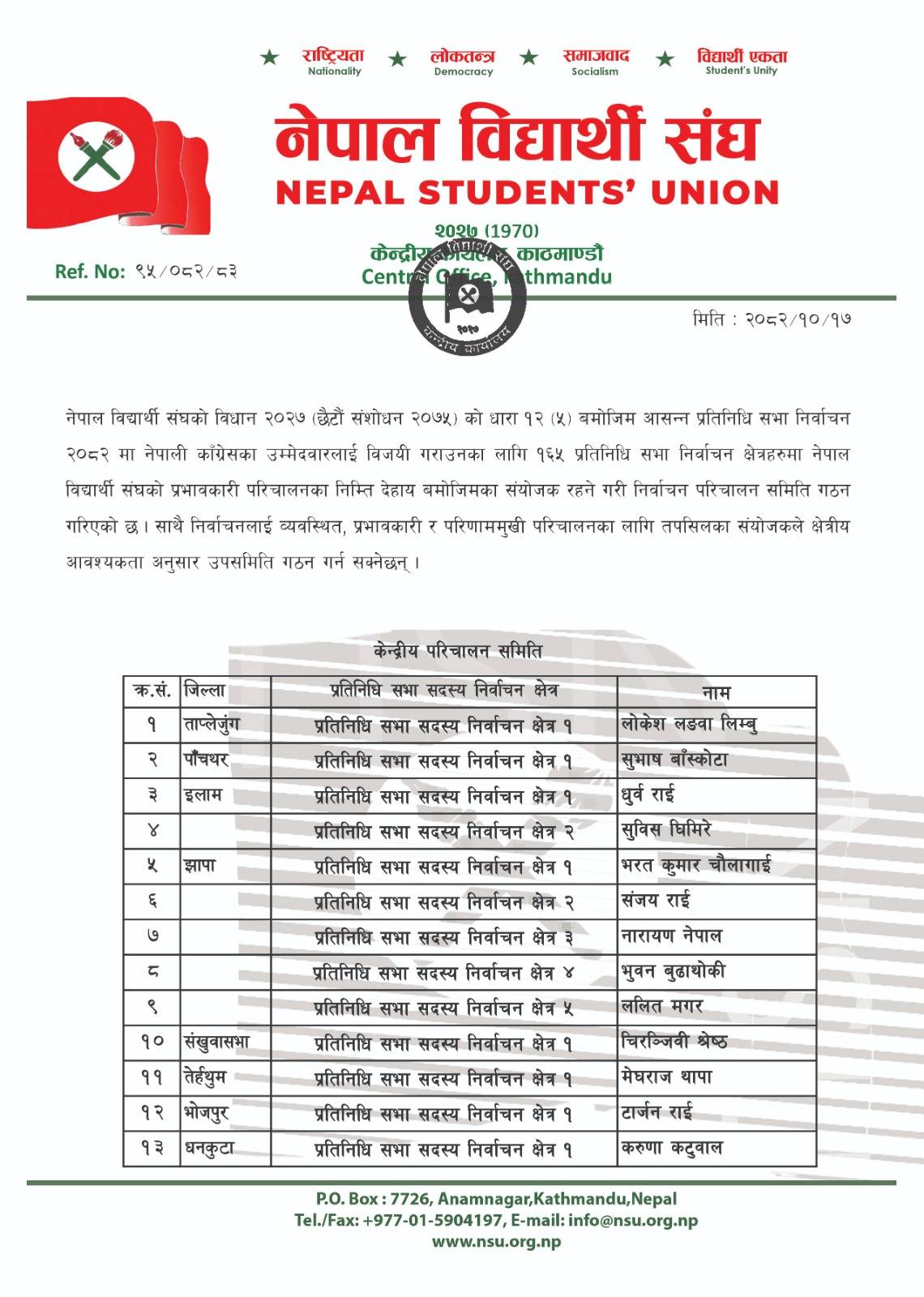 नेपाली कांग्रेसको भ्रातृ संगठन नेपाल विद्यार्थी संघले आगामी २१ फागुनमा हुने प्रतिनिधिसभा चुनावलाई लक्षित गरी निर्वाचन परिचालन समिति गठन गरेको छ ।