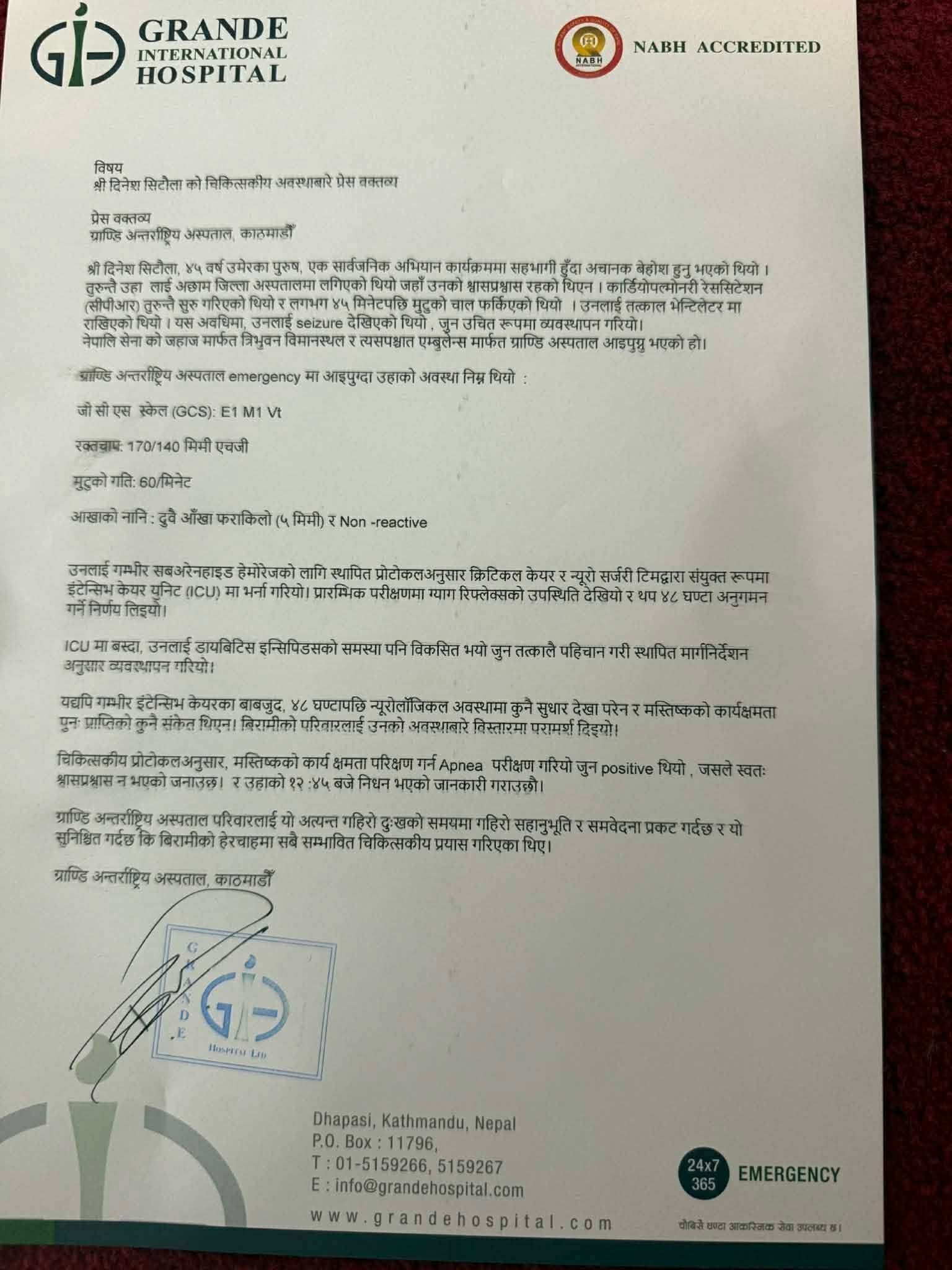 अस्पतालले एक विज्ञप्तिमार्फत आइतबार १२ः४५ मा मृत्यु भएको पुष्टि गरेको छ ।