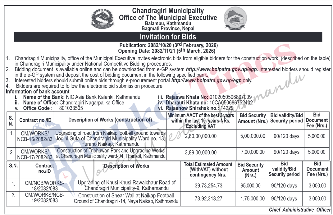 मंगलबार एक सूचना जारी गर्दै नगरले विभिन्न आयोजनाका लागि विद्युतीय बोलपत्र (टेण्डर) आह्वान गरेको हो ।