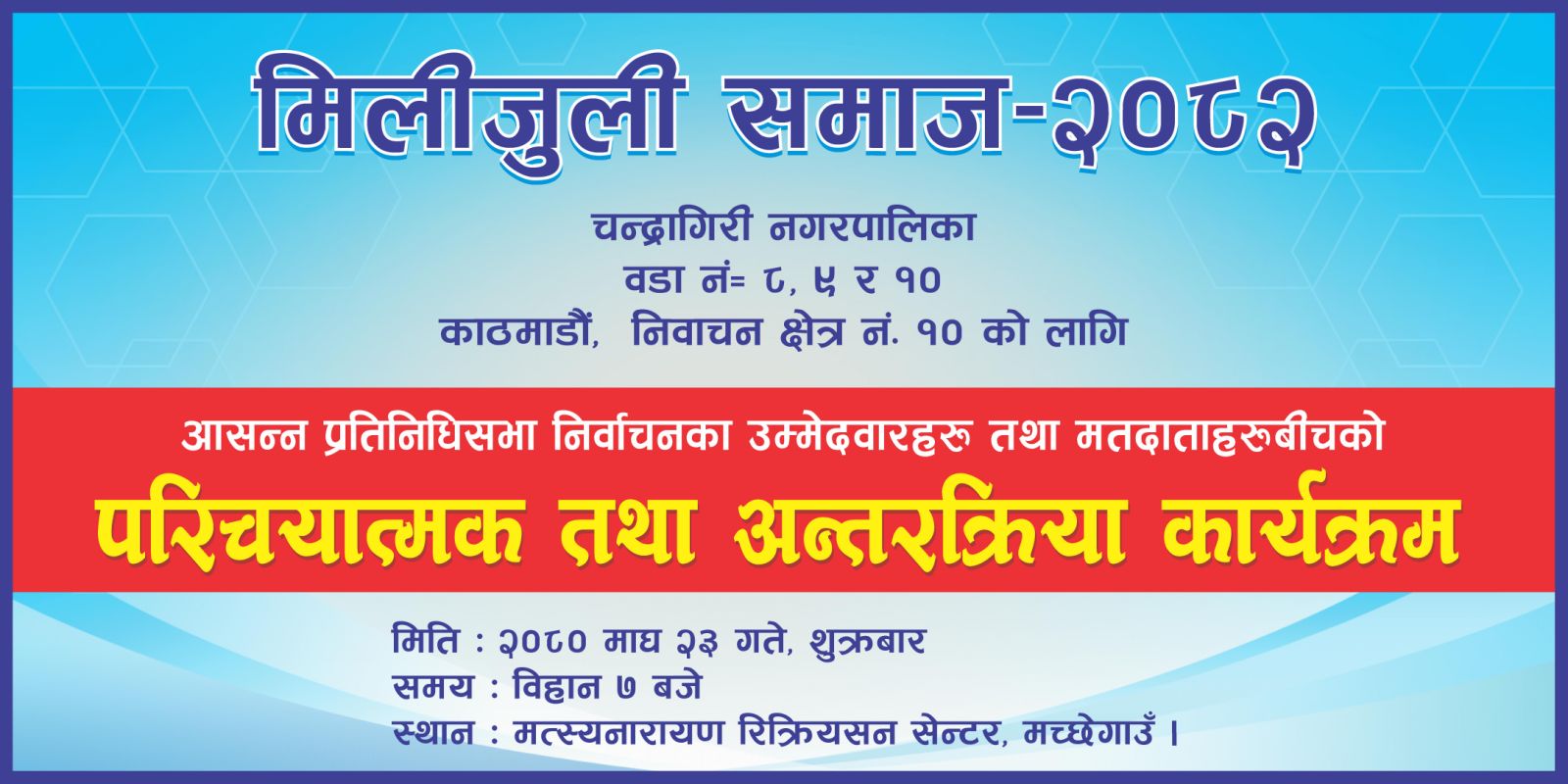 मिलीजुली समाजको अग्रसरतामा उक्त दिन उम्मेदवार-मतदाता अन्तर्क्रिया कार्यक्रम संयोजन गरिएको चन्द्रागिरि नगरपालिका वडा नं. ९ मच्छेगाउँका वडाध्यक्ष अच्यूत अधिकारीले जानकारी दिए ।
