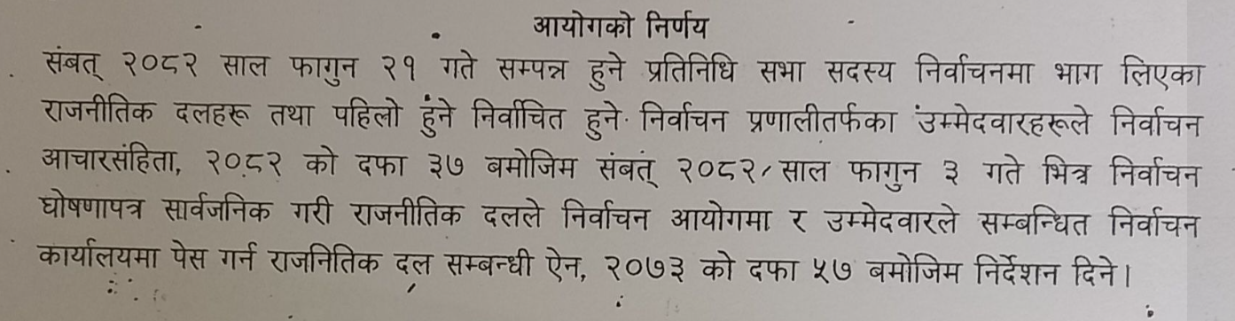 आयोगले मंगलबार (माघ २७) आचारसंहिताको दफा ३७ बमोजिम दलले आयोगमा र उमेदवारलाई निर्वाचन कार्यालयमा पेस गर्न निर्देशन दिएको हो ।