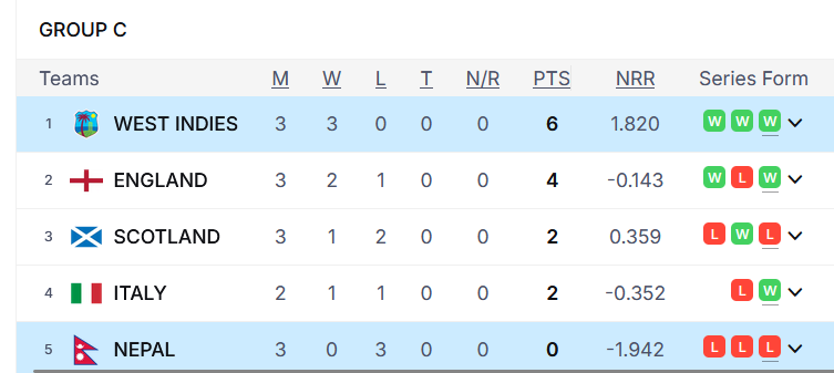 हारपछि नेपाल प्रतियोगिताबाट बाहिरिएको छ भने वेस्ट इन्डिज लगातार तेस्रो जितसहित प्रतियोगिताको सुपर ८ मा प्रवेश गरेको छ । अब नेपालले प्रतियोगिताको अन्तिम खेलमा यहि मंगलबार स्कटल्याण्डको सामना गर्नेछ ।