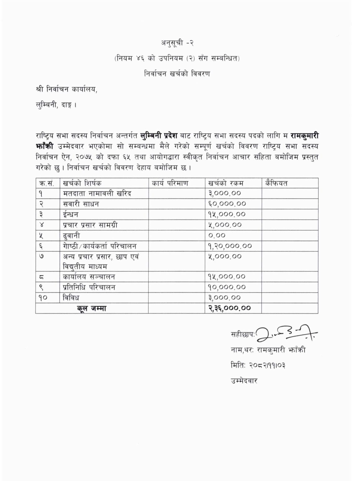 राष्ट्रिय सभा सदस्य रामकुमारी झाँक्रीद्वारा चुनावी खर्चको विवरण सार्वजनिक