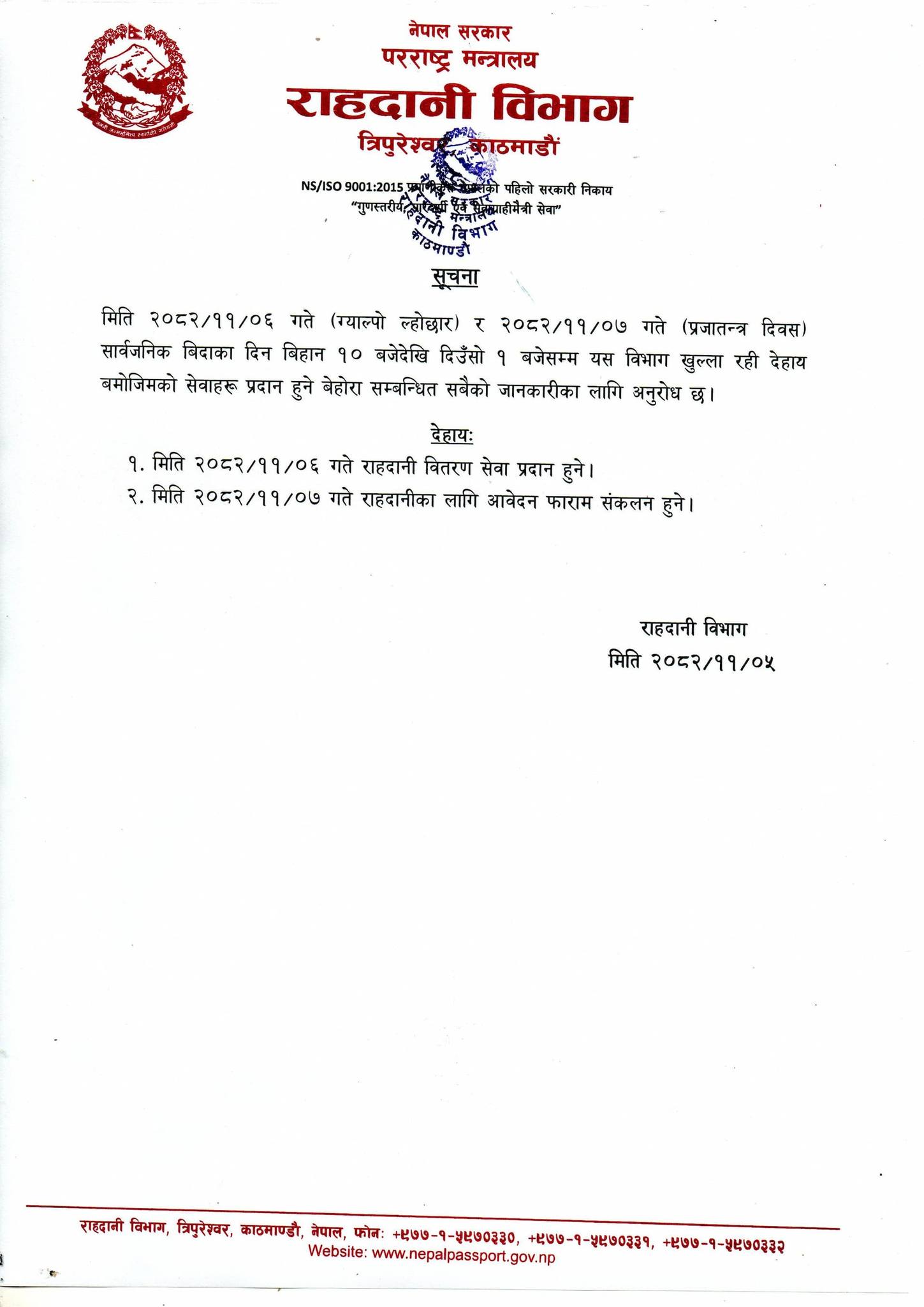विभागले सार्वजनिक सूचना निकालेर आज र भोलि सार्वजनिक बिदा भए पनि राहदानी वितरणलगायतका कामका लागि विभाग खुला रहने जनाएको हो ।
