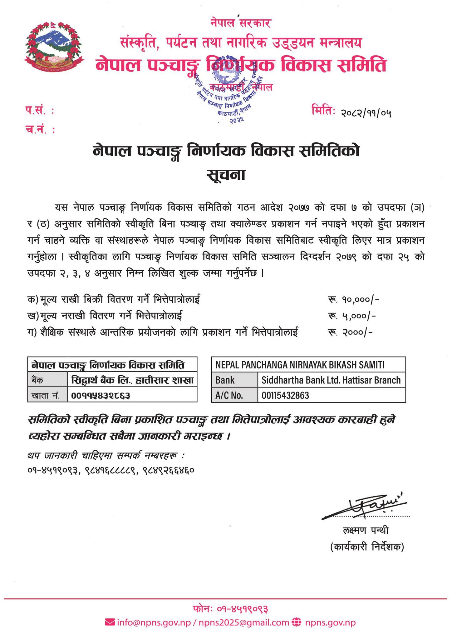 नेपाल पञ्चाङ्ग निर्णायक विकास समितिको स्वीकृत नलिई भित्तेपात्रे छापेमा १ लाख रुपैयाँसम्म जरिवाना हुने भएको छ ।