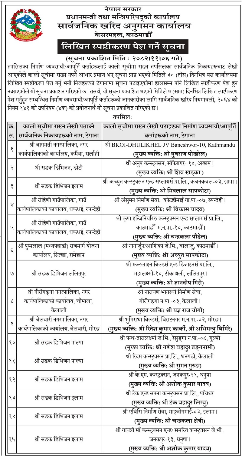 कार्यालयले सूचना प्रकाशित भएको मितिले ७ दिनभित्र लिखित स्पष्टीकरण पेश गर्न मौका दिएको हो । सडक डिभिजन डोटी, सडक डिभिजन इलाम, सडक डिभिजन पाल्पा, सडक डिभिजन ललितपुरलगायतका निकायबाट सिफारिस भएका व्यवसायी तथा कम्पनीहरू रहेका छन् । जसमा अनुप कन्स्ट्रक्सन, अच्युत कन्स्ट्रक्सन एण्ड सप्लायर्स, नागार्जुन/आशिका जे.भी, पन्थ–तारा लक्ष्मी जे.भी, रिदम कन्स्ट्रक्सन लगायत रहेका छन् ।