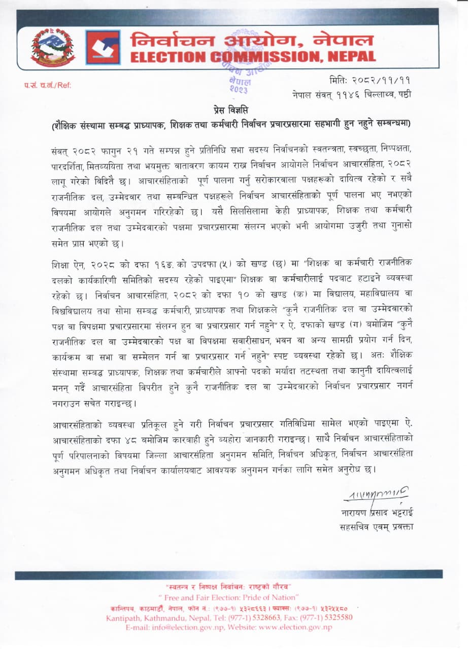 निर्वाचन आयोगले शैक्षिक संस्थामा सम्बद्ध प्राध्यापक, शिक्षक तथा कर्मचारी निर्वाचन प्रचारप्रसारमा सहभागी भएको पाइएमा कारबाही हुने जनाएको छ।