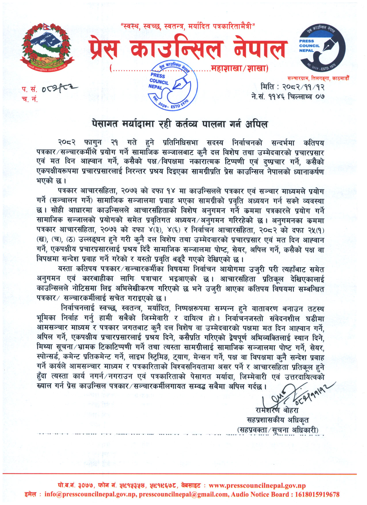 प्रेस काउन्सिल नेपालले निर्वाचनको अवधिमा पूर्ण रूपमा निष्पक्ष एवं उत्तरदायी बन्न आग्रह गरेको छ ।