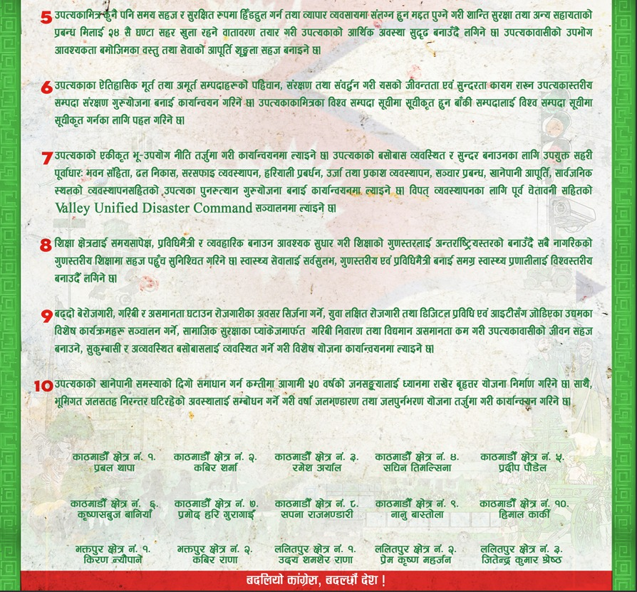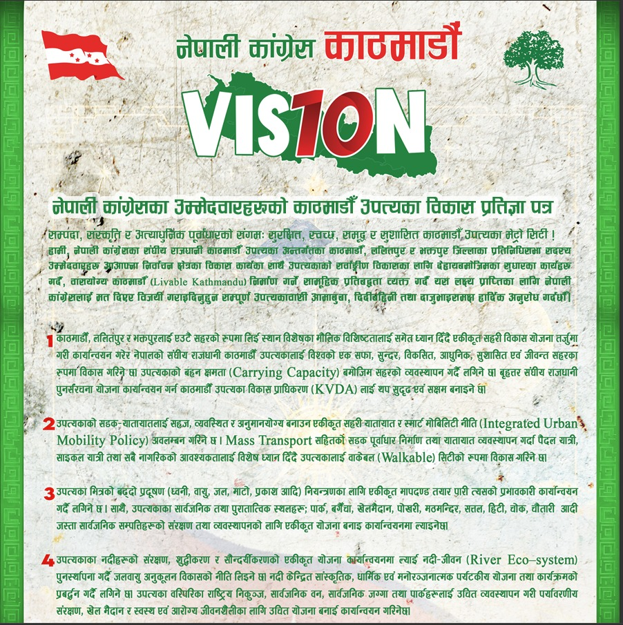 काठमाडौं उपत्यका अन्तर्गत पर्ने काठमाडौं, ललितपुर र भक्तपुरमा नेपाली कांग्रेसका उम्मेदवारहरूले विकासको मार्गचित्र भिजन १० सहित साझा प्रतिबद्धता सार्वजनिक गरेका छन्।