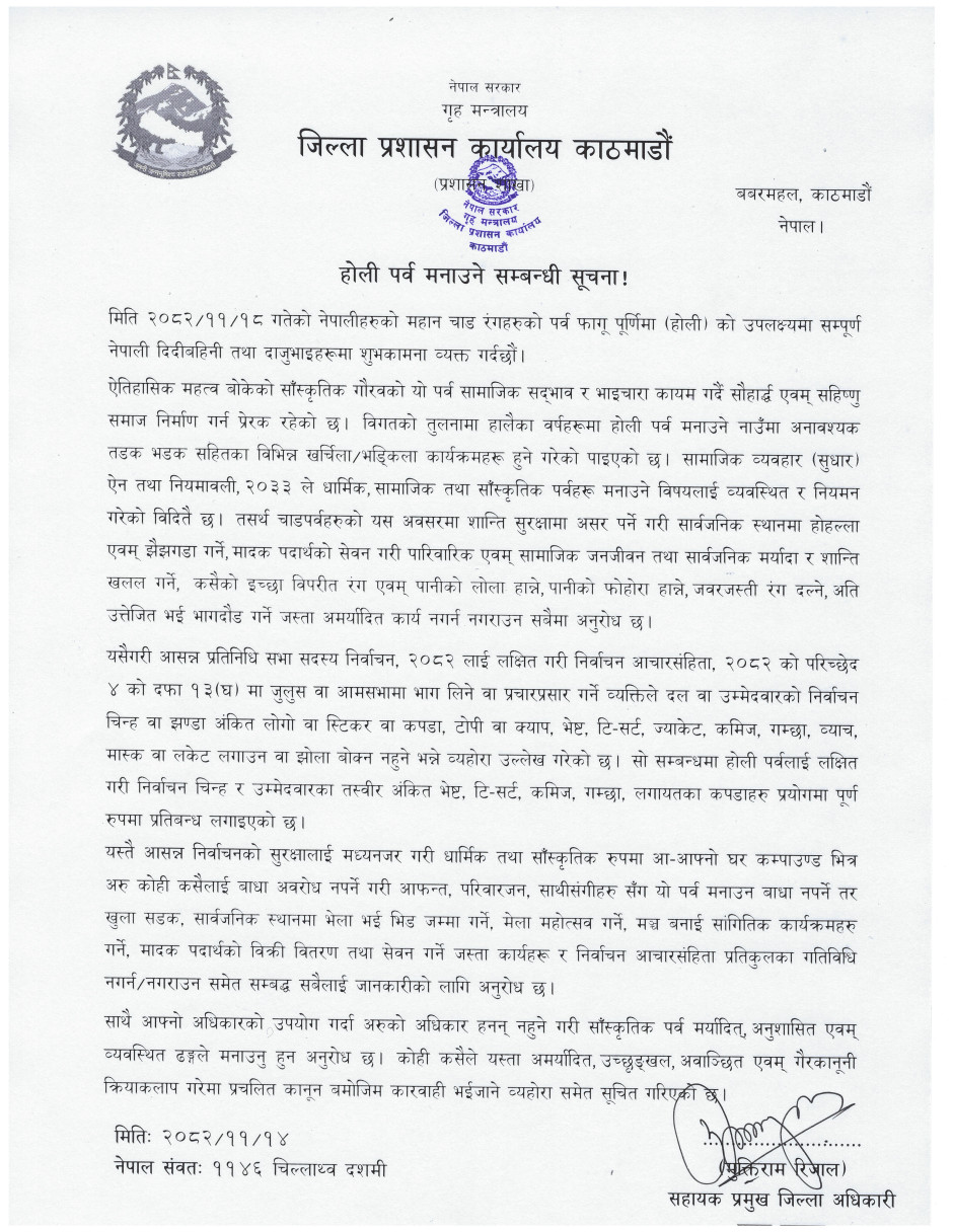 सहायक प्रमुख जिल्ला अधिकारी मुक्तिराम रिजालले बिहीबार (फागुन १४) सूचना प्रकाशन गरी होलीका अवसरमा सार्वजनिक स्थानमा भीड नगर्न आग्रह गरेका हुन् ।
