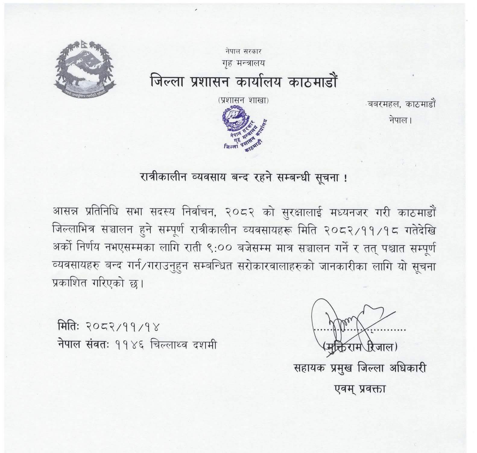 जिल्ला प्रशासन कार्यालय काठमाडौंले प्रतिनिधि सभा सदस्य निर्वाचनको सुरक्षालाई मध्यनजरी गरी रात्रिकालीन व्यवसायहरू राति ९ बजेसम्म मात्र सञ्चालन गर्न सूचना प्रकाशित गरेको छ ।