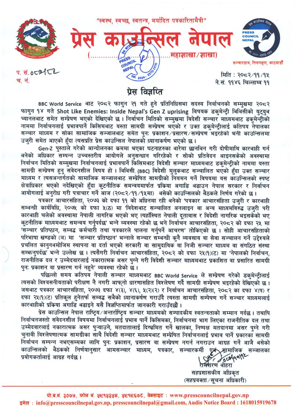 “बिबिसी वल्र्ड न्यूज सर्भिसबाट २०८२ फागुन २१ गते हुने प्रतिनिधिसभा सदस्य निर्वाचनको सम्मुखमा २०८२ फागुन १४ गते ‘सट लाइक इनिमिजः इनसाइड नेपाल्स जेनजी अपराइजिङ’ विषयक वृत्तचित्र बिबिसीको युट्युब च्यानलबाट समेत सम्प्रेषण भएको देखिएको छ”, काउन्सिलका सहप्रवक्ता रामशरण बोहराद्वारा जारी विज्ञप्तिमा भनिएको छ, “नेपाली सञ्चारमाध्यमले उक्त वृत्तचित्रको विश्वसनीयताको परीक्षण नै नगरी आफ्नो धारणासहित विश्लेषण गर्दै सामग्री सम्प्रेषण गरिरहेको देखिएको छ ।”