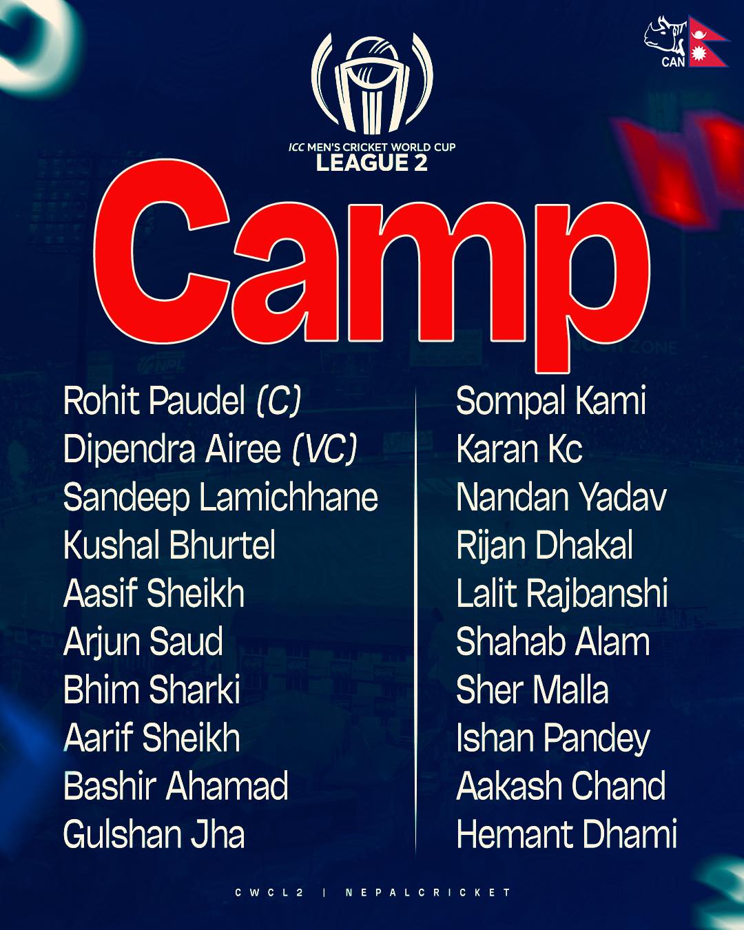 नेपाल क्रिकेट संघ (क्यान)ले २० सदस्यीय प्रारम्भिक टोलीको घोषणा गरेको हो ।