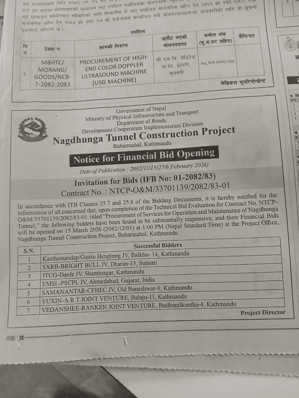 यस्तै एआरटी कन्स्ट्रक्सनले चोङकिङ युसिन रोड एण्ड ब्रिज डेभलपमेन्ट कम्पनी, ब्राइट बुल निर्माण सेवाले शान्सी रोड एण्ड ब्रिज ग्रुप कर्पोरेसन लिमिटेड र पशुपति शिवजी कन्स्ट्रक्सनले एल्सामेक्स मेन्टिनेन्स सर्भिस लिमिटेड प्राविधिक मूल्याङ्कनमा पास भएका छन्।