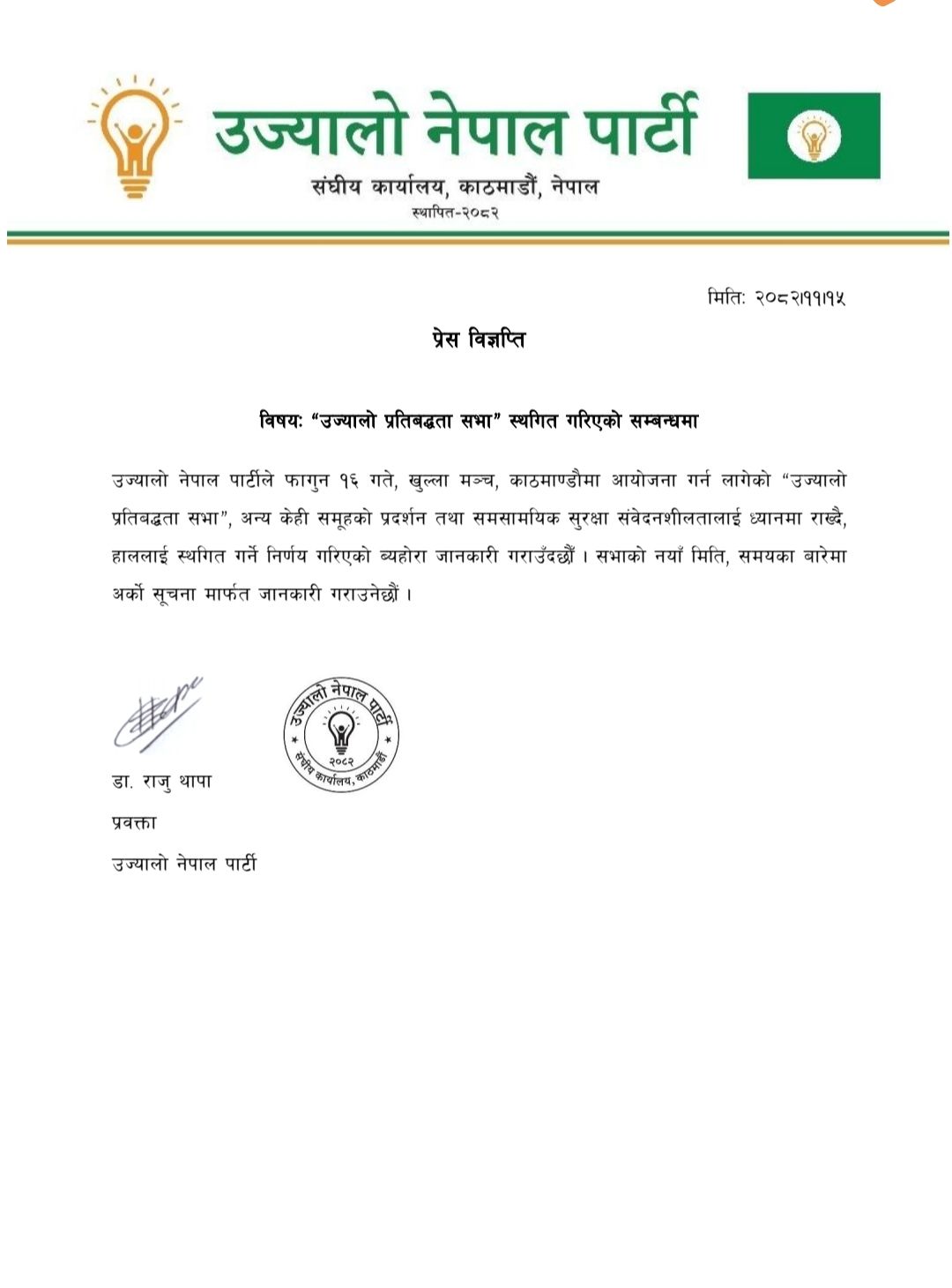 उज्यालो नेपाल पार्टीले पूर्वनिर्धारित चुनावी सभा स्थगन गरेको छ । शनिबार (फागुन १६) दिउँसो १ बजेदेखि काठमाडौंको टुँडिखेलस्थित खुलामञ्चमा गर्ने भनिएको सभा रोकिएको हो ।