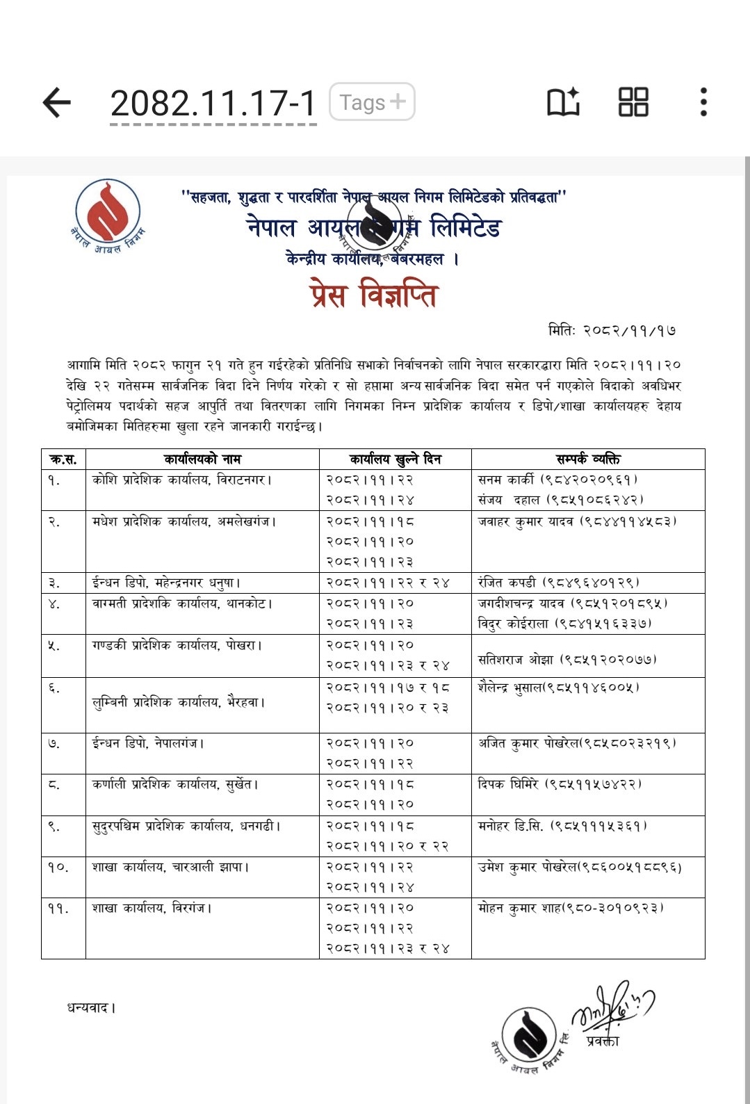 सम्बन्धित प्रादेशिक कार्यालय तथा डिपो/शाखा कार्यालयहरू कुन–कुन मितिमा खुला रहनेछन् भन्ने जानकारी छुट्टै रूपमा सार्वजनिक गरिने जनाइएको छ।