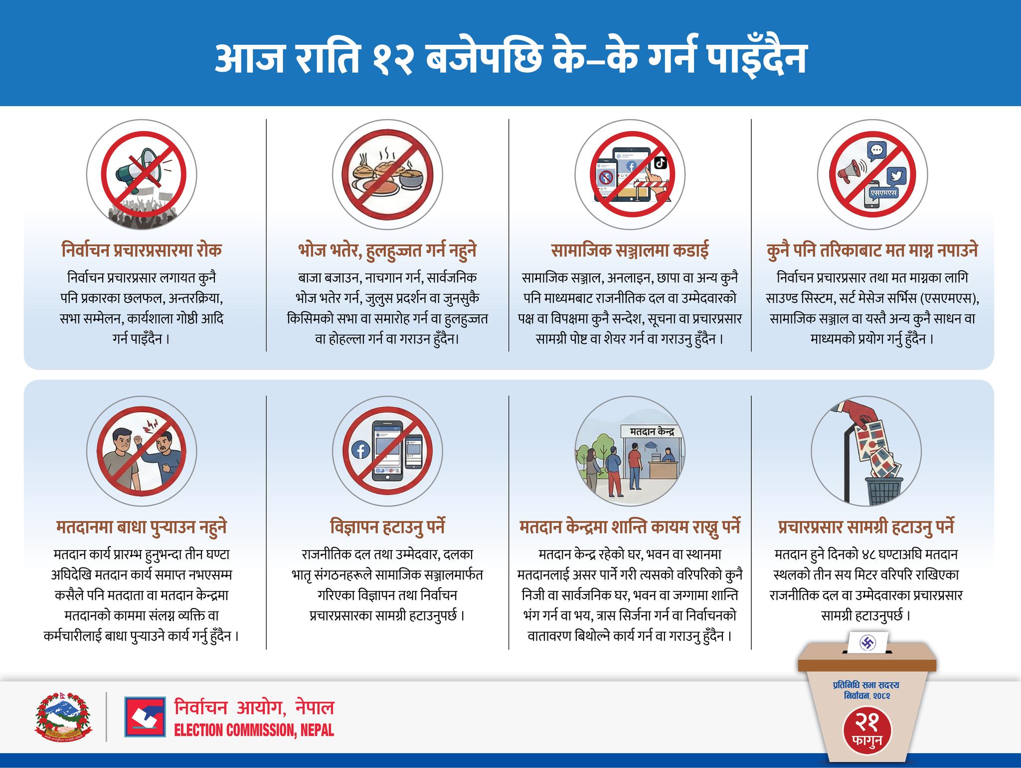 मतदान हुनु ४८ घण्टाअघिबाट मतदान सम्पन्न नभएसम्म कायम हुने मौन अवधिमा प्रचारप्रसार, भाषण, भेला, छलफल, समीक्षालगायत निर्वाचनलाई प्रभाव पार्ने गरी कुनै पनि गतिविधि गर्न पाइने छैन। मौन अवधिमा मत माग्न, पोस्ट गर्न, निर्वाचनलाई प्रभाव पार्ने गरी हिँडडुललगायतका क्रियाकलाप गर्न नपाइने आयोगले जनाएको छ।