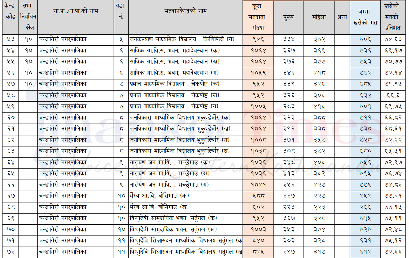 बिहीबार सम्पन्न प्रतिनिधि सभा सदस्य निर्वाचनमा काठमाडाैं जिल्ला निर्वाचन क्षेत्र नं. १० अन्तर्गत चन्द्रागिरि नगरपालिकामा क्षेत्रमा २२०१७ मत खसेको बताइएको छ ।