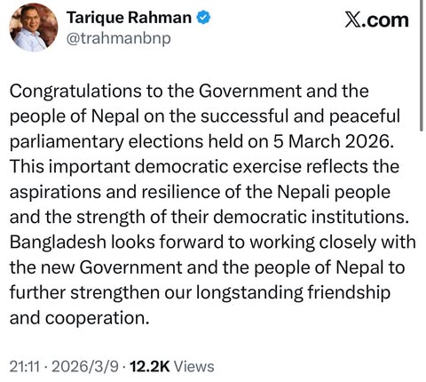 हालसालै चुनाव गरेर दुईतिहाईको सरकार बनाएका बङ्गलादेशका प्रधानमन्त्री तारिक रहमानले चुनाव सम्पन्न गरेकोमा नेपालीलाई  बधाई दिएका छन् ।