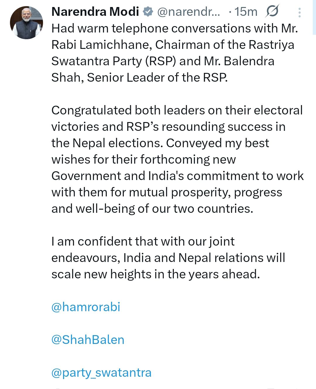 यस्तै, भारतका प्रधानमन्त्री नरेन्द्र मोदीले राष्ट्रिय स्वतन्त्र पार्टी (रास्वपा) का सभापति रवि लामिछाने र वरिष्ठ नेता बालेन्द्र शाह (बालेन)लाई बधाई दिएका छन् । भारतीय प्रधानमन्त्री माेदीले फोन गरेर लामिछाने र शाहलाई बधाई दिएका हुन् ।