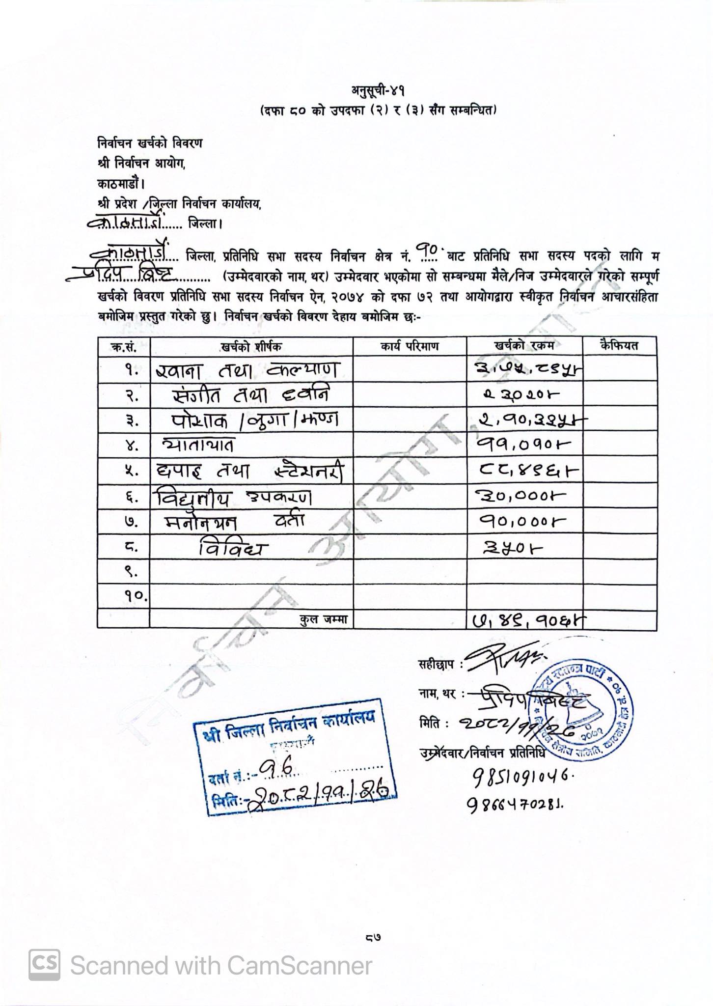 रास्वपा काठमाडाैं जिल्ला सभापति प्रदिप विष्टको चुनावी खर्च ७ लाख ४९ हजार